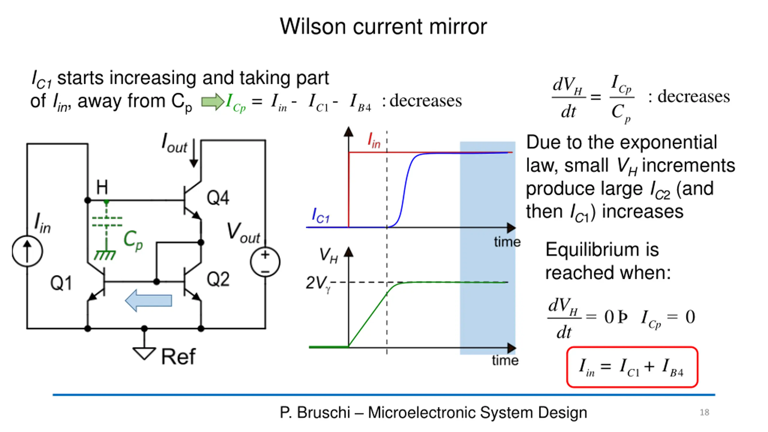 Wilson current mirror: start-up transient = - - I I I I until: 1 4 C p in C B Q2, Q4: off 0 C I = 0 = < < = 2 I V I Vg H 0, = 0, 4 4 2 B C I = I CI Cp in 1 0 I C dV dt Cp = = constant H p As VHapproaches 2V , Q4 and Q2 turn on and the Q2 current is mirrored to M1 P. Bruschi Microelectronic System Design 17