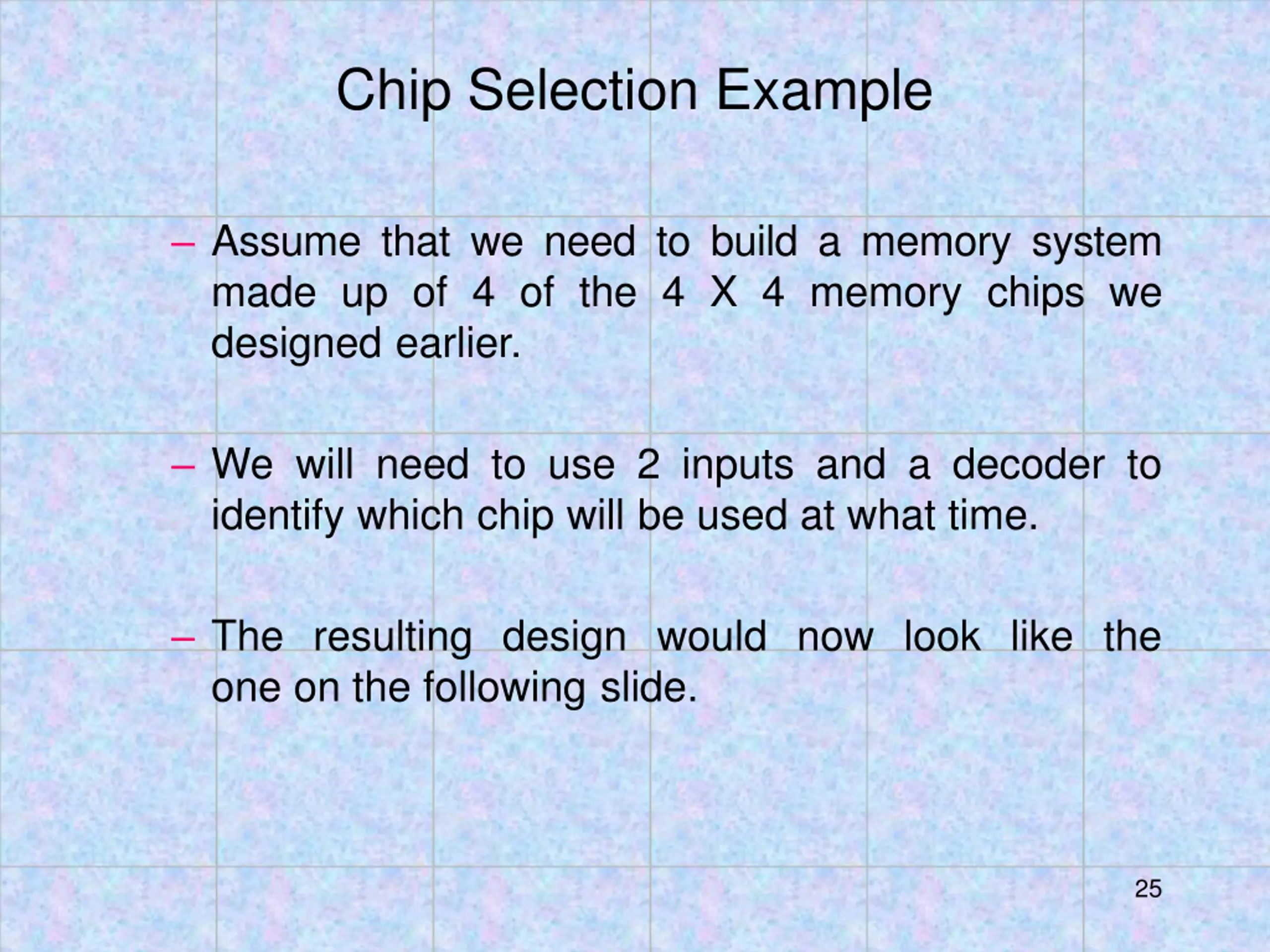 Chip Selection Example Assume that we need to build a memory system made up of 4 of the 4 X 4 memory chips we designed earlier. We will need to use 2 inputs and a decoder to identify which chip will be used at what time. The resulting design would now look like the one on the following slide. 25