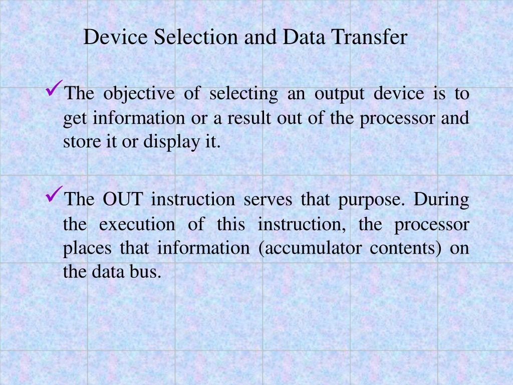 Device Selection and Data Transfer The objective of selecting an output device is to get information or a result out of the processor and store it or display it. The OUT instruction serves that purpose. During the execution of this instruction, the processor places that information (accumulator contents) on the data bus.