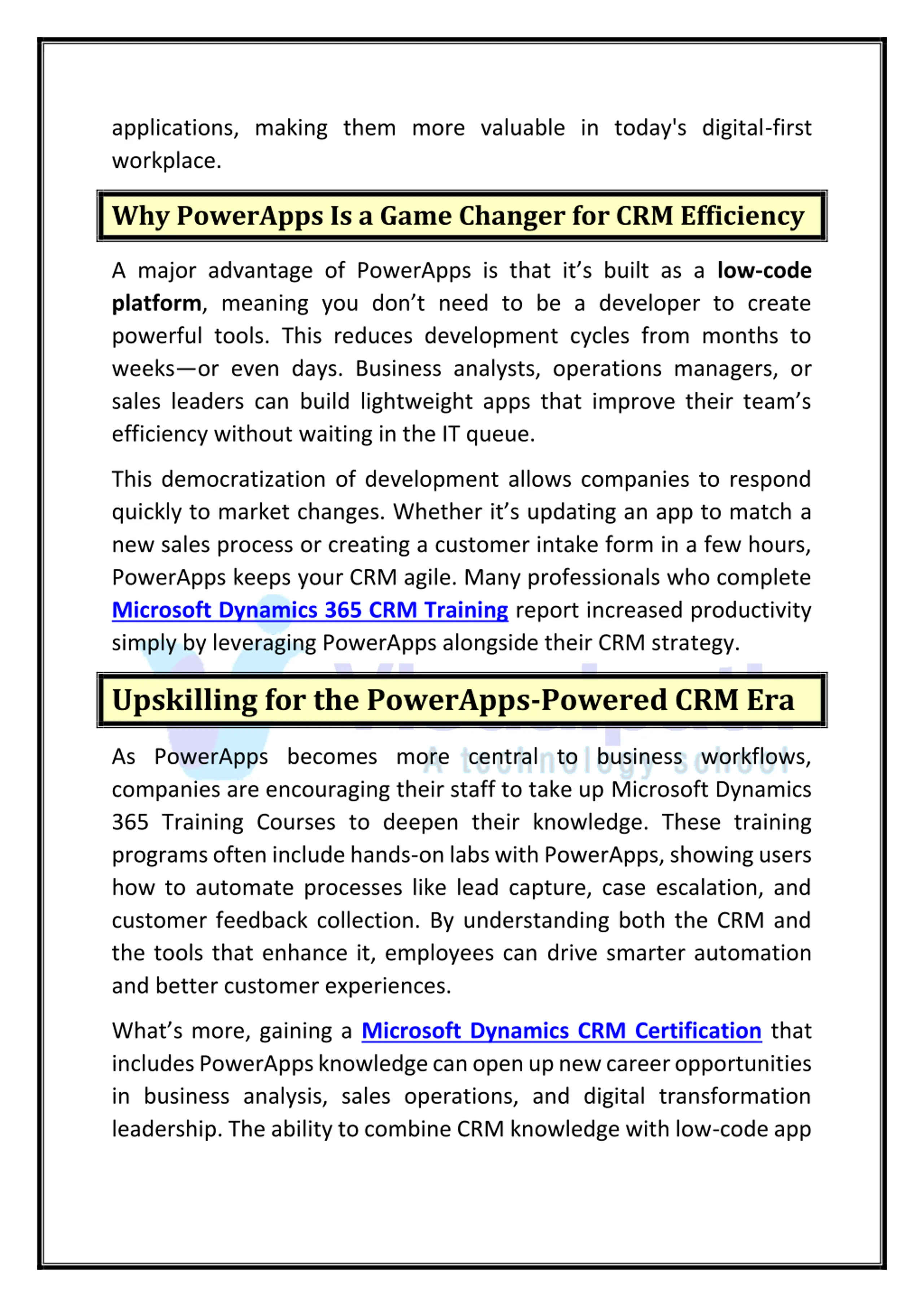 applications, making them more valuable in today's digital-first workplace. Why PowerApps Is a Game Changer for CRM Efficiency A major advantage of PowerApps is that it s built as a low-code platform, meaning you don t need to be a developer to create powerful tools. This reduces development cycles from months to weeks or even days. Business analysts, operations managers, or sales leaders can build lightweight apps that improve their team s efficiency without waiting in the IT queue. This democratization of development allows companies to respond quickly to market changes. Whether it s updating an app to match a new sales process or creating a customer intake form in a few hours, PowerApps keeps your CRM agile. Many professionals who complete Microsoft Dynamics 365 CRM Training report increased productivity simply by leveraging PowerApps alongside their CRM strategy. Upskilling for the PowerApps-Powered CRM Era As PowerApps becomes more central to business workflows, companies are encouraging their staff to take up Microsoft Dynamics 365 Training Courses to deepen their knowledge. These training programs often include hands-on labs with PowerApps, showing users how to automate processes like lead capture, case escalation, and customer feedback collection. By understanding both the CRM and the tools that enhance it, employees can drive smarter automation and better customer experiences. What s more, gaining a Microsoft Dynamics CRM Certification that includes PowerApps knowledge can open up new career opportunities in business analysis, sales operations, and digital transformation leadership. The ability to combine CRM knowledge with low-code app