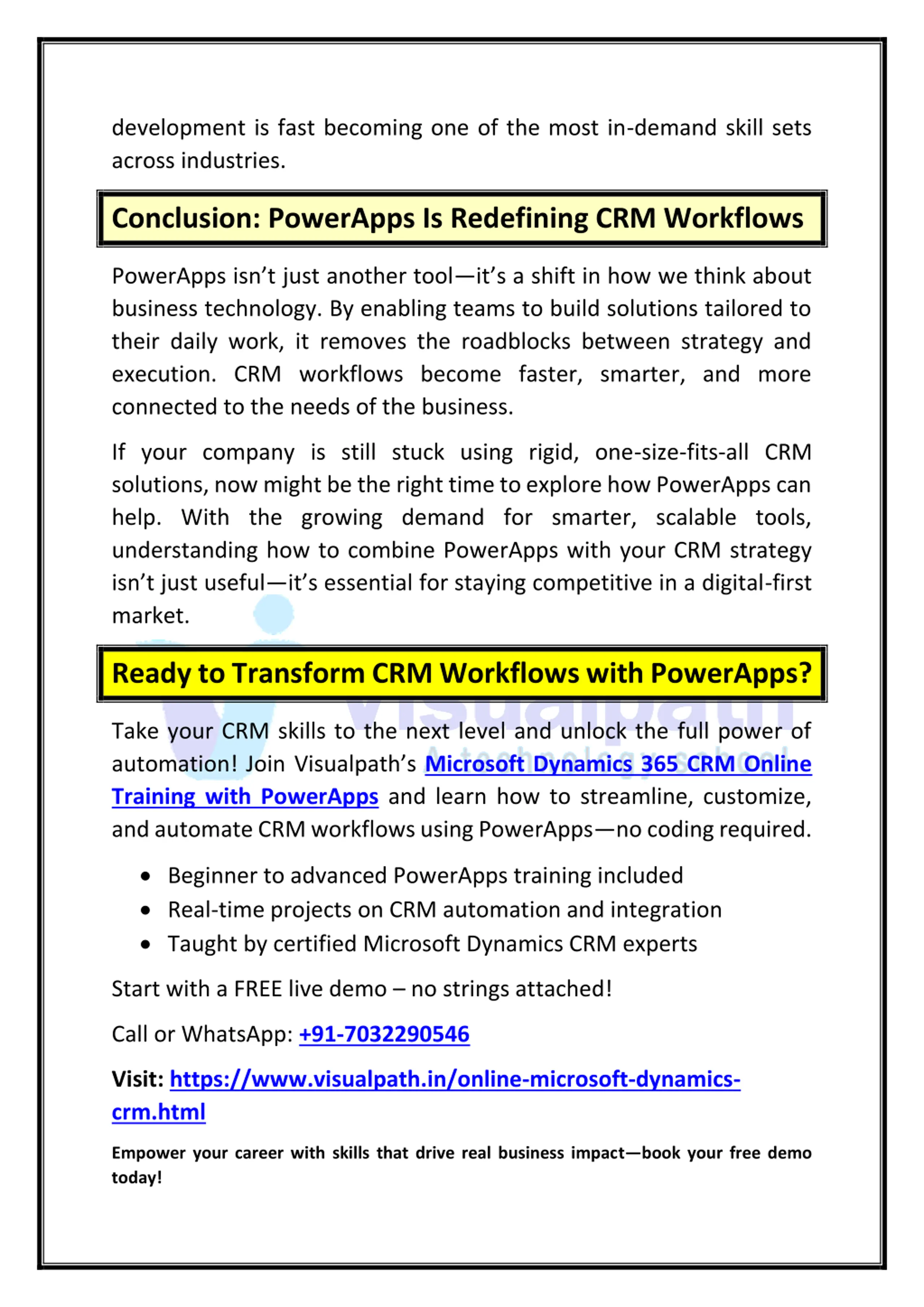 development is fast becoming one of the most in-demand skill sets across industries. Conclusion: PowerApps Is Redefining CRM Workflows PowerApps isn t just another tool it s a shift in how we think about business technology. By enabling teams to build solutions tailored to their daily work, it removes the roadblocks between strategy and execution. CRM workflows become faster, smarter, and more connected to the needs of the business. If your company is still stuck using rigid, one-size-fits-all CRM solutions, now might be the right time to explore how PowerApps can help. With the growing demand for smarter, scalable tools, understanding how to combine PowerApps with your CRM strategy isn t just useful it s essential for staying competitive in a digital-first market. Ready to Transform CRM Workflows with PowerApps? Take your CRM skills to the next level and unlock the full power of automation! Join Visualpath s Microsoft Dynamics 365 CRM Online Training with PowerApps and learn how to streamline, customize, and automate CRM workflows using PowerApps no coding required. Beginner to advanced PowerApps training included Real-time projects on CRM automation and integration Taught by certified Microsoft Dynamics CRM experts Start with a FREE live demo no strings attached! Call or WhatsApp: +91-7032290546 Visit: https://www.visualpath.in/online-microsoft-dynamics- crm.html Empower your career with skills that drive real business impact book your free demo today!