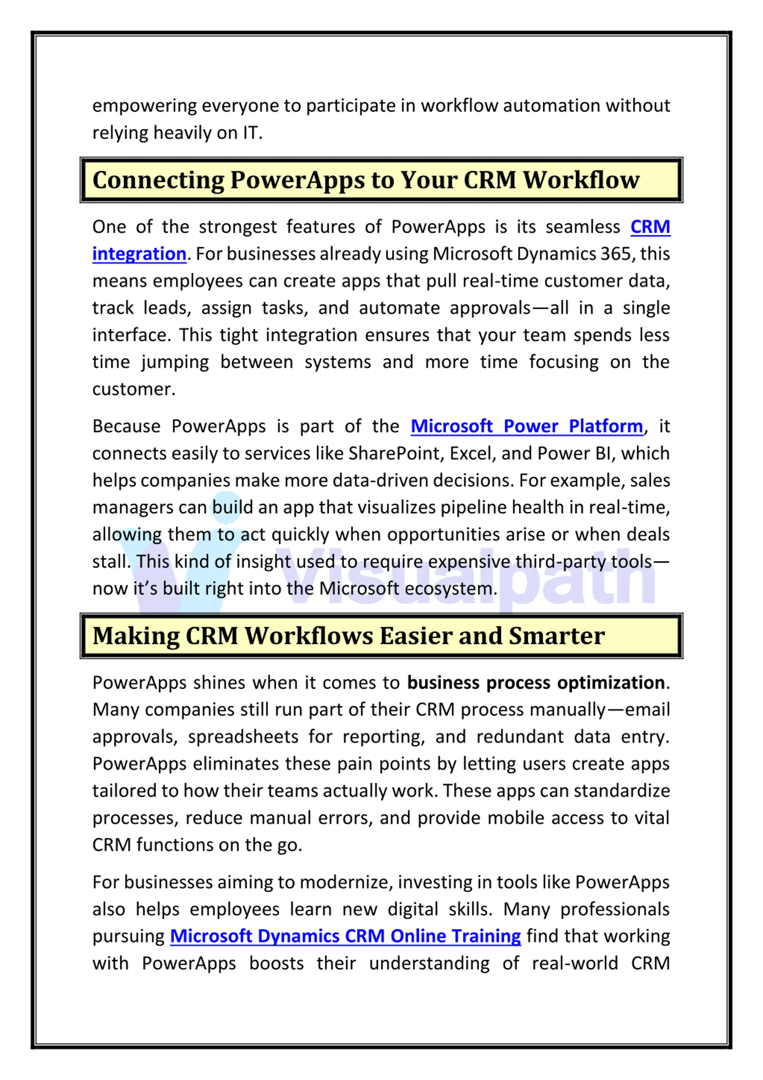 empowering everyone to participate in workflow automation without relying heavily on IT. Connecting PowerApps to Your CRM Workflow One of the strongest features of PowerApps is its seamless CRM integration. For businesses already using Microsoft Dynamics 365, this means employees can create apps that pull real-time customer data, track leads, assign tasks, and automate approvals all in a single interface. This tight integration ensures that your team spends less time jumping between systems and more time focusing on the customer. Because PowerApps is part of the Microsoft Power Platform, it connects easily to services like SharePoint, Excel, and Power BI, which helps companies make more data-driven decisions. For example, sales managers can build an app that visualizes pipeline health in real-time, allowing them to act quickly when opportunities arise or when deals stall. This kind of insight used to require expensive third-party tools now it s built right into the Microsoft ecosystem. Making CRM Workflows Easier and Smarter PowerApps shines when it comes to business process optimization. Many companies still run part of their CRM process manually email approvals, spreadsheets for reporting, and redundant data entry. PowerApps eliminates these pain points by letting users create apps tailored to how their teams actually work. These apps can standardize processes, reduce manual errors, and provide mobile access to vital CRM functions on the go. For businesses aiming to modernize, investing in tools like PowerApps also helps employees learn new digital skills. Many professionals pursuing Microsoft Dynamics CRM Online Training find that working with PowerApps boosts their understanding of real-world CRM