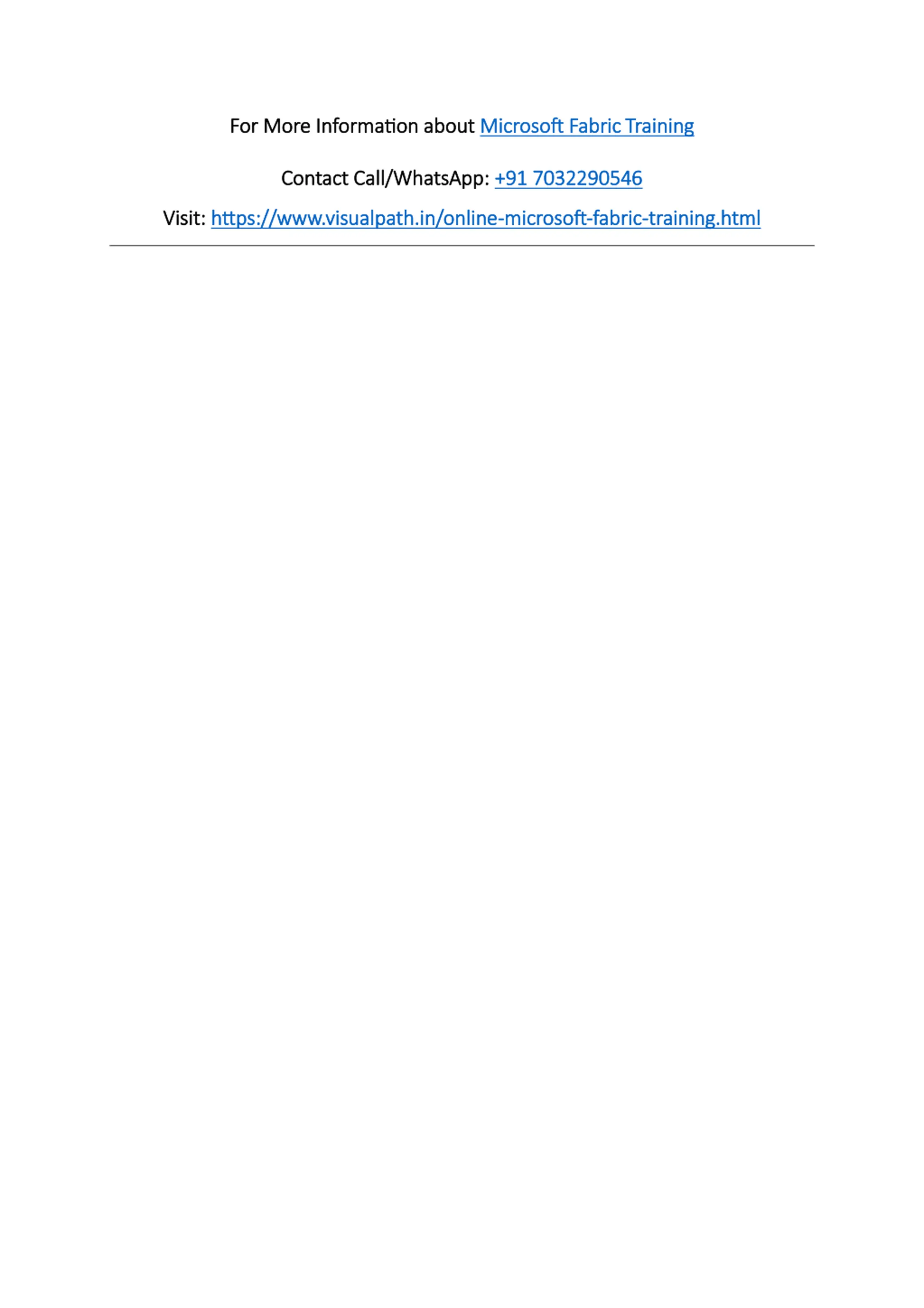For More Information about For More Information about Microsoft Fabric Microsoft FabricTraining Training Contact Call/WhatsApp: Contact Call/WhatsApp: +91 7032290546 +91 7032290546 Visit: Visit: https://www.visualpath.in/online https://www.visualpath.in/online- -microsoft microsoft- -fabric fabric- -training.html training.html