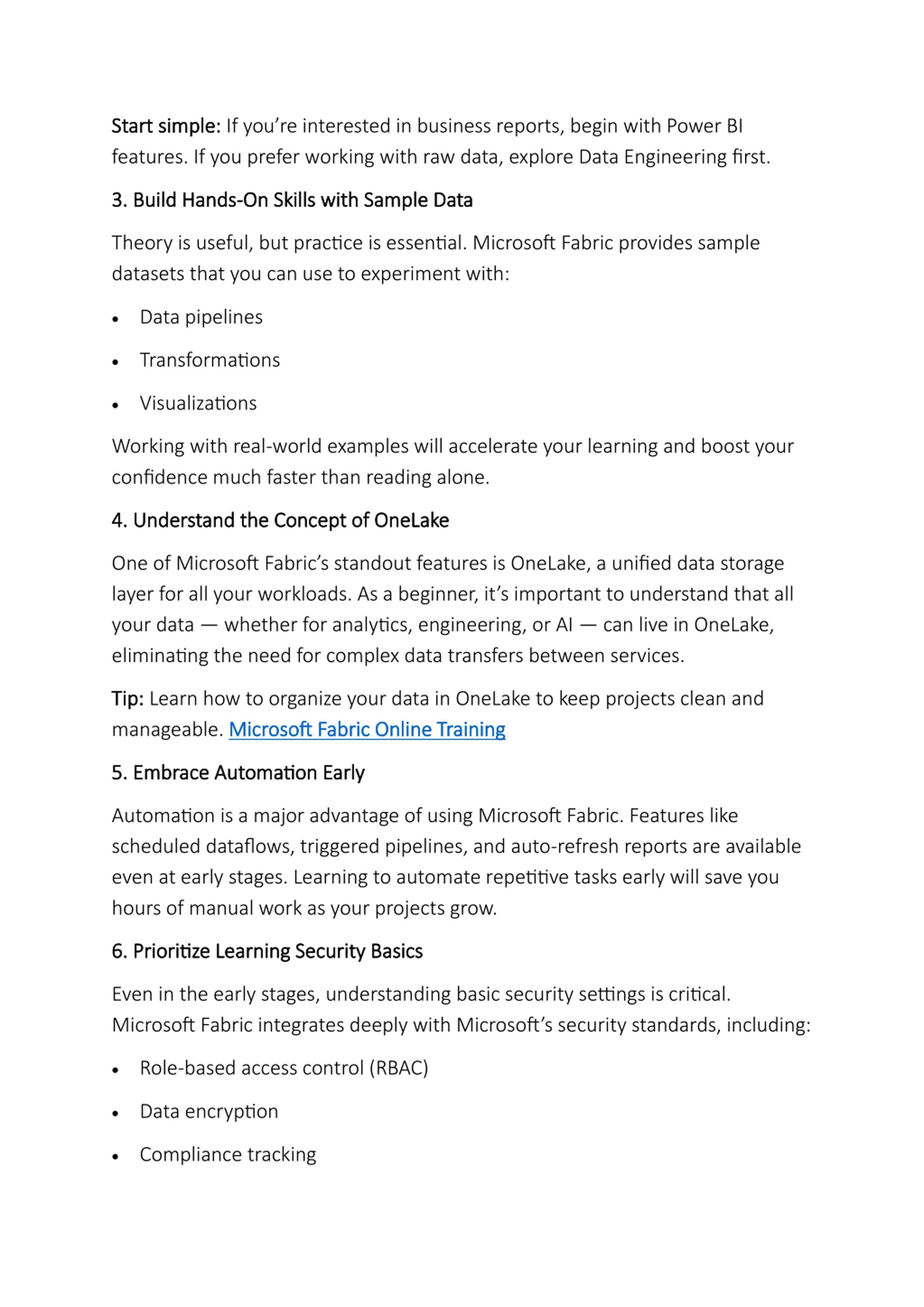Start simple: Start simple: If you re interested in business reports, begin with Power BI features. If you prefer working with raw data, explore Data Engineering first. 3. Build Hands 3. Build Hands- -On Skills with Sample Data On Skills with Sample Data Theory is useful, but practice is essential. Microsoft Fabric provides sample datasets that you can use to experiment with: Data pipelines Transformations Visualizations Working with real-world examples will accelerate your learning and boost your confidence much faster than reading alone. 4. Understand the Concept of OneLake 4. Understand the Concept of OneLake One of Microsoft Fabric s standout features is OneLake, a unified data storage layer for all your workloads. As a beginner, it s important to understand that all your data whether for analytics, engineering, or AI can live in OneLake, eliminating the need for complex data transfers between services. Tip: Tip: Learn how to organize your data in OneLake to keep projects clean and manageable. Microsoft Fabric Online Training Microsoft Fabric Online Training 5. Embrace Automation Early 5. Embrace Automation Early Automation is a major advantage of using Microsoft Fabric. Features like scheduled dataflows, triggered pipelines, and auto-refresh reports are available even at early stages. Learning to automate repetitive tasks early will save you hours of manual work as your projects grow. 6. Prioritize Learning Security Basics 6. Prioritize Learning Security Basics Even in the early stages, understanding basic security settings is critical. Microsoft Fabric integrates deeply with Microsoft s security standards, including: Role-based access control (RBAC) Data encryption Compliance tracking