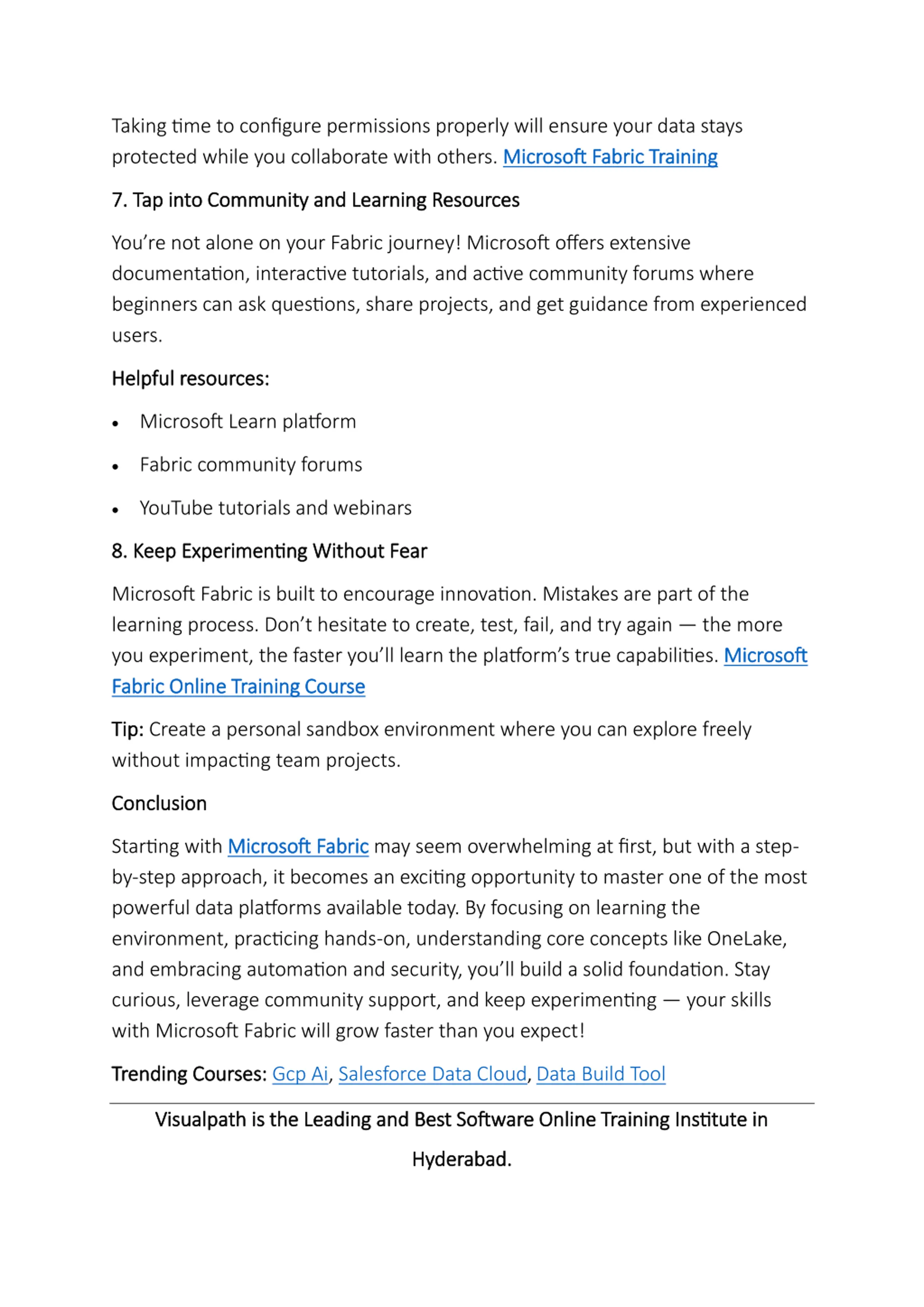 Taking time to configure permissions properly will ensure your data stays protected while you collaborate with others. Microsoft Fabric Training Microsoft Fabric Training 7. Tap into Community and Learning Resources 7. Tap into Community and Learning Resources You re not alone on your Fabric journey! Microsoft offers extensive documentation, interactive tutorials, and active community forums where beginners can ask questions, share projects, and get guidance from experienced users. Helpful resources: Helpful resources: Microsoft Learn platform Fabric community forums YouTube tutorials and webinars 8. Keep Experimenting Without Fear 8. Keep Experimenting Without Fear Microsoft Fabric is built to encourage innovation. Mistakes are part of the learning process. Don t hesitate to create, test, fail, and try again the more you experiment, the faster you ll learn the platform s true capabilities. Microsoft Fabric Online Training Course Fabric Online Training Course Microsoft Tip: Tip: Create a personal sandbox environment where you can explore freely without impacting team projects. Conclusion Conclusion Starting with Microsoft Fabric Microsoft Fabric may seem overwhelming at first, but with a step- by-step approach, it becomes an exciting opportunity to master one of the most powerful data platforms available today. By focusing on learning the environment, practicing hands-on, understanding core concepts like OneLake, and embracing automation and security, you ll build a solid foundation. Stay curious, leverage community support, and keep experimenting your skills with Microsoft Fabric will grow faster than you expect! Trending Trending Courses Courses: : Gcp Ai, Salesforce Data Cloud, Data Build Tool Visualpath is the Leading and Best Software Online Training Institute in Visualpath is the Leading and Best Software Online Training Institute in Hyderabad. Hyderabad.