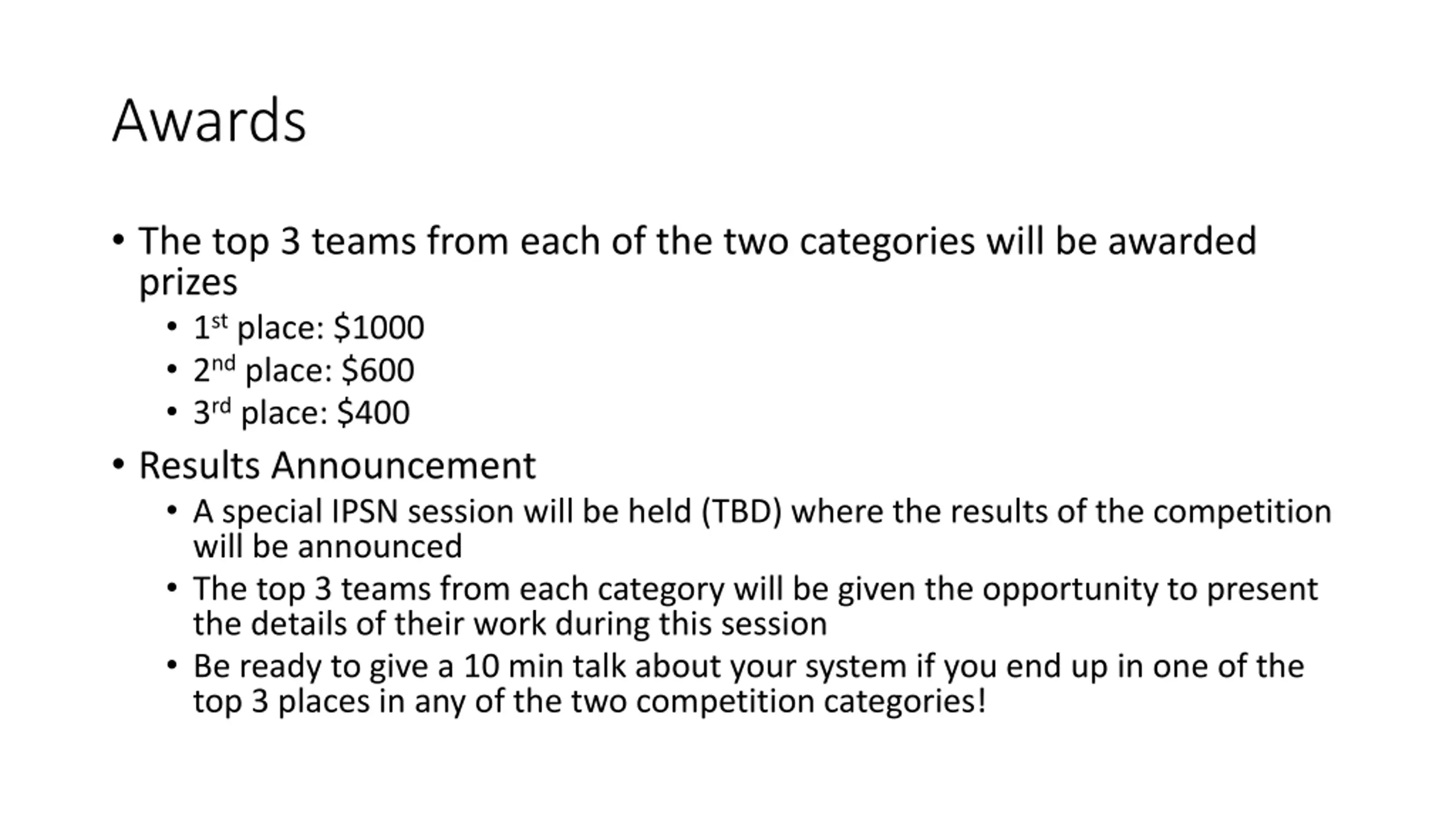 Awards The top 3 teams from each of the two categories will be awarded prizes 1st place: $1000 2nd place: $600 3rd place: $400 Results Announcement A special IPSN session will be held (TBD) where the results of the competition will be announced The top 3 teams from each category will be given the opportunity to present the details of their work during this session Be ready to give a 10 min talk about your system if you end up in one of the top 3 places in any of the two competition categories!