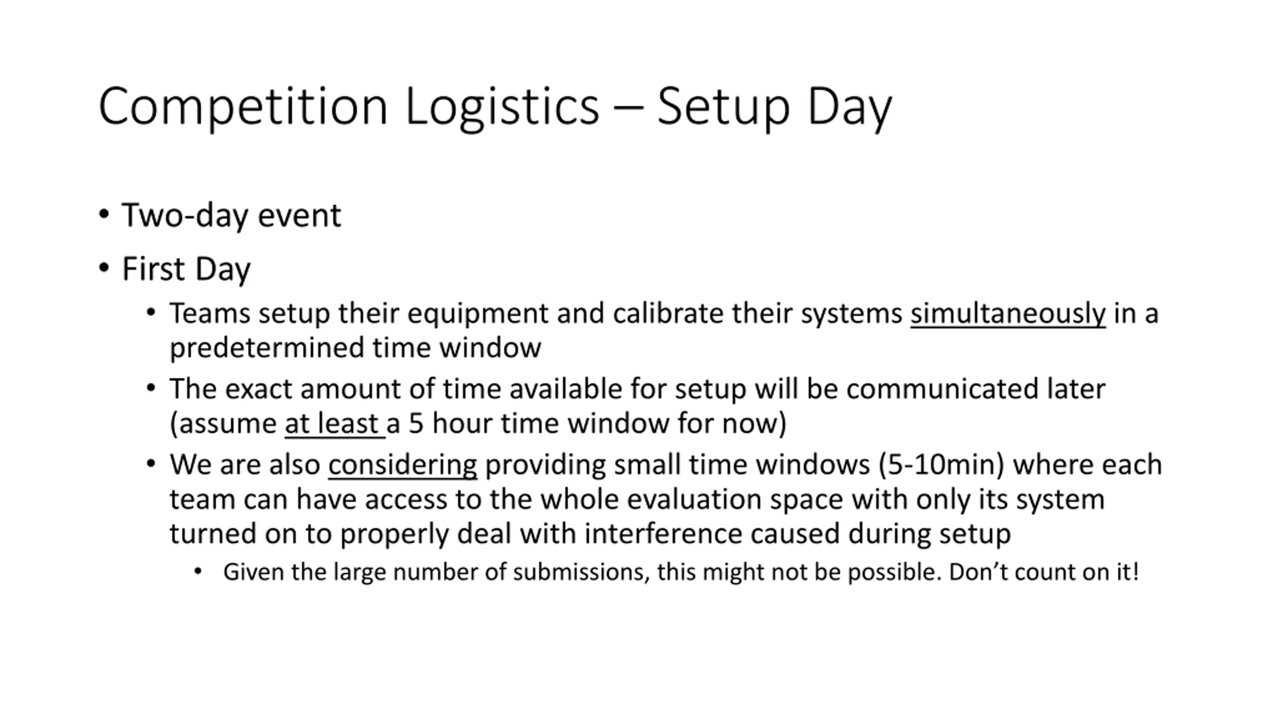 Competition Logistics Setup Day Two-day event First Day Teams setup their equipment and calibrate their systems simultaneously in a predetermined time window The exact amount of time available for setup will be communicated later (assume at least a 5 hour time window for now) We are also considering providing small time windows (5-10min) where each team can have access to the whole evaluation space with only its system turned on to properly deal with interference caused during setup Given the large number of submissions, this might not be possible. Don t count on it!