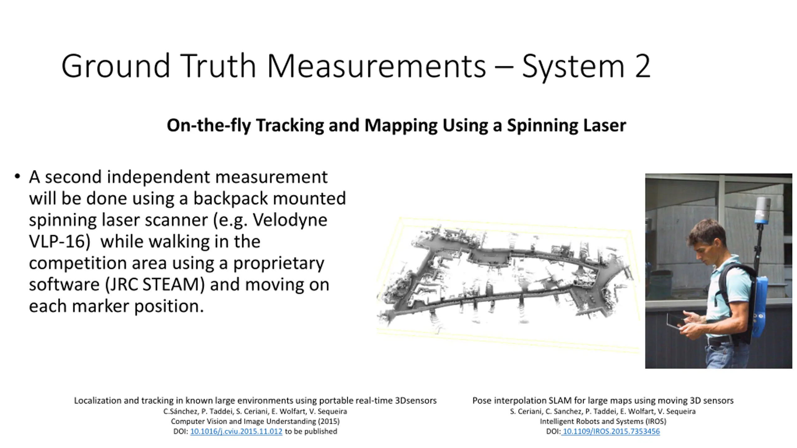Ground Truth Measurements System 2 On-the-fly Tracking and Mapping Using a Spinning Laser A second independent measurement will be done using a backpack mounted spinning laser scanner (e.g. Velodyne VLP-16) while walking in the competition area using a proprietary software (JRC STEAM) and moving on each marker position. Localization and tracking in known large environments using portable real-time 3Dsensors C.S nchez, P. Taddei, S. Ceriani, E. Wolfart, V. Sequeira Computer Vision and Image Understanding (2015) DOI: 10.1016/j.cviu.2015.11.012 to be published Pose interpolation SLAM for large maps using moving 3D sensors S. Ceriani, C. Sanchez, P. Taddei, E. Wolfart, V. Sequeira Intelligent Robots and Systems (IROS) DOI: 10.1109/IROS.2015.7353456