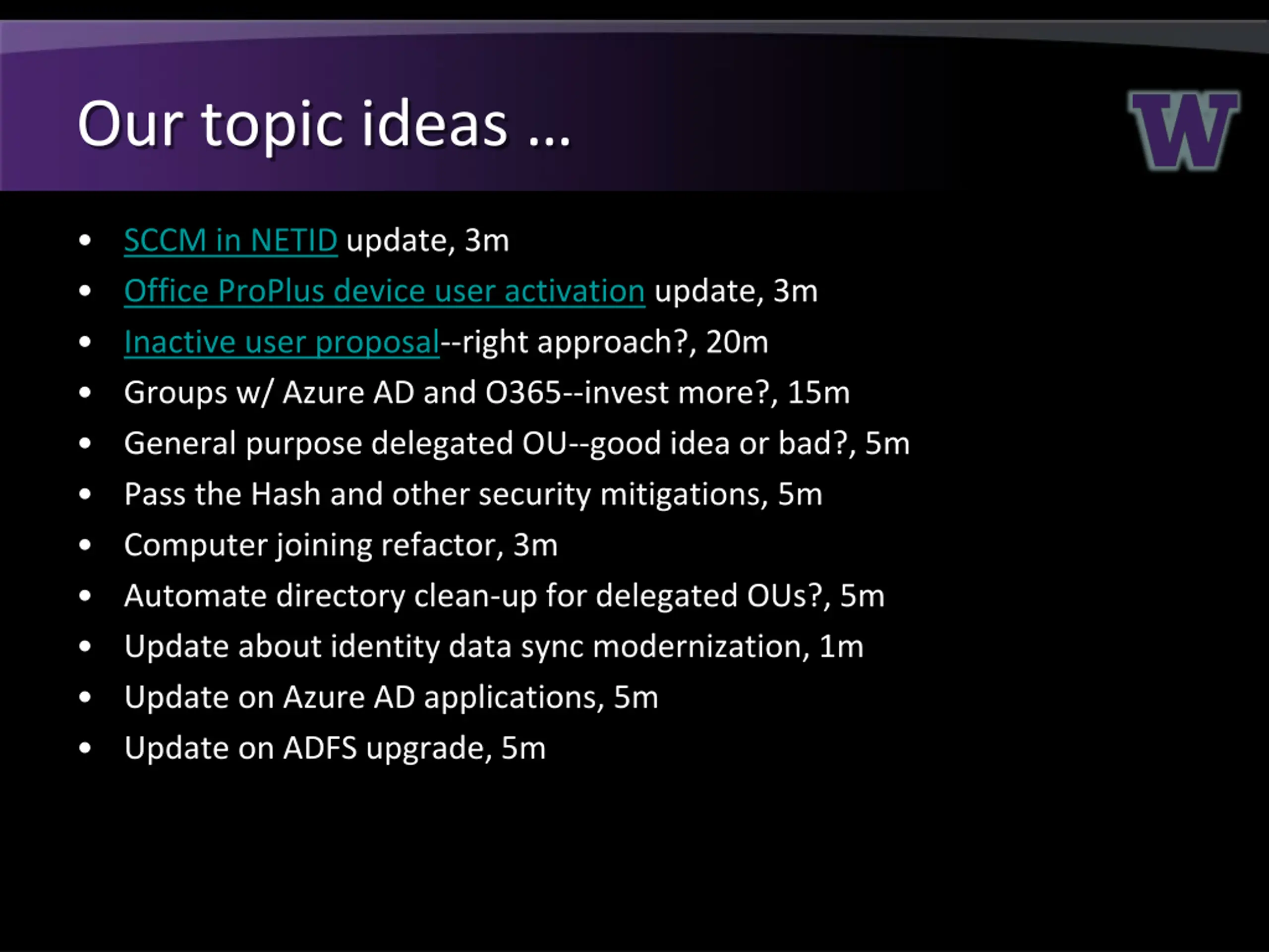 Our topic ideas SCCM in NETID update, 3m Office ProPlus device user activation update, 3m Inactive user proposal--right approach?, 20m Groups w/ Azure AD and O365--invest more?, 15m General purpose delegated OU--good idea or bad?, 5m Pass the Hash and other security mitigations, 5m Computer joining refactor, 3m Automate directory clean-up for delegated OUs?, 5m Update about identity data sync modernization, 1m Update on Azure AD applications, 5m Update on ADFS upgrade, 5m