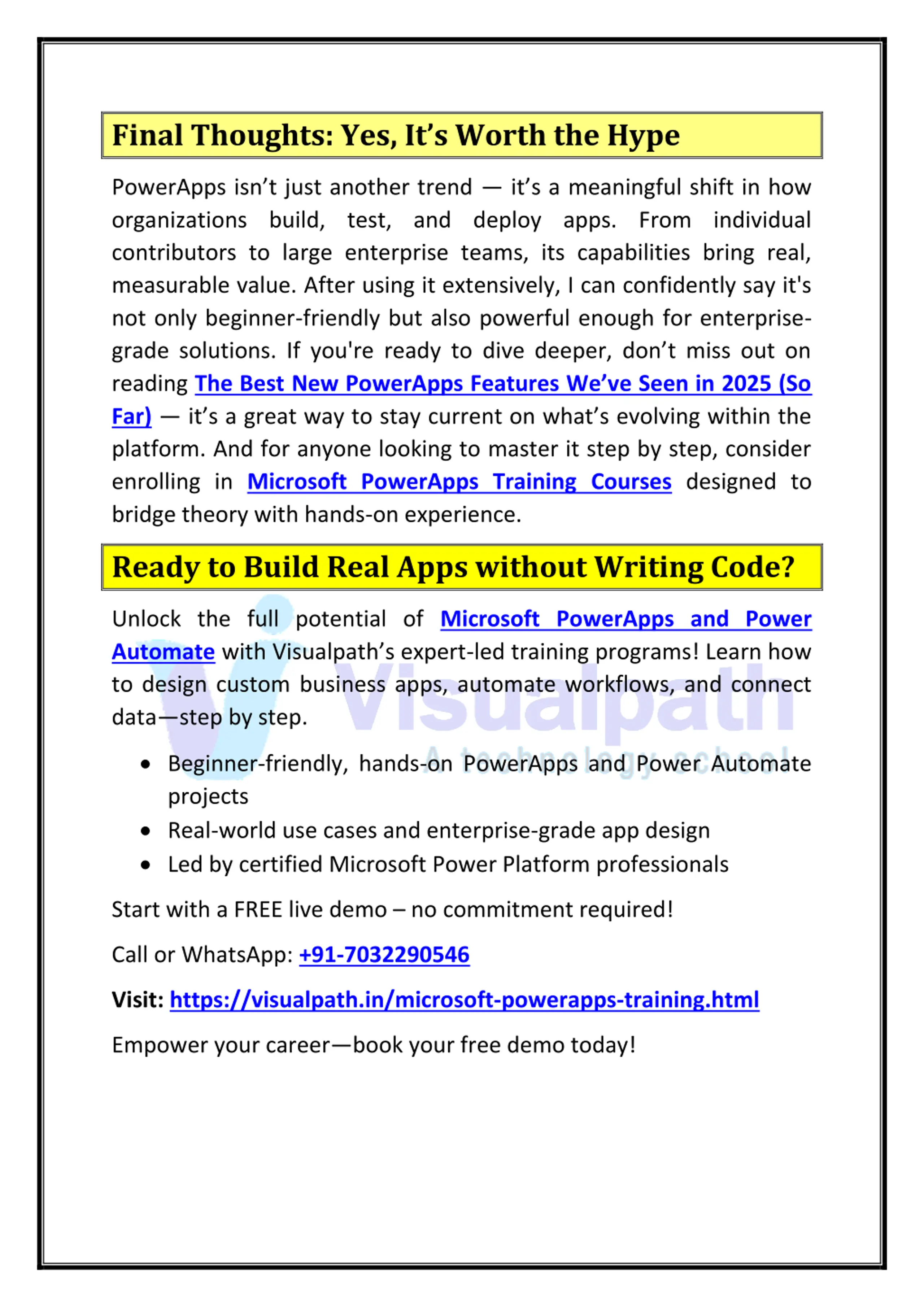 Final Thoughts: Yes, Its Worth the Hype PowerApps isn t just another trend it s a meaningful shift in how organizations build, test, and deploy apps. From individual contributors to large enterprise teams, its capabilities bring real, measurable value. After using it extensively, I can confidently say it's not only beginner-friendly but also powerful enough for enterprise- grade solutions. If you're ready to dive deeper, don t miss out on reading The Best New PowerApps Features We ve Seen in 2025 (So Far) it s a great way to stay current on what s evolving within the platform. And for anyone looking to master it step by step, consider enrolling in Microsoft PowerApps Training Courses designed to bridge theory with hands-on experience. Ready to Build Real Apps without Writing Code? Unlock the full potential of Microsoft PowerApps and Power Automatewith Visualpath s expert-led training programs! Learn how to design custom business apps, automate workflows, and connect data step by step. Beginner-friendly, hands-on PowerApps and Power Automate projects Real-world use cases and enterprise-grade app design Led by certified Microsoft Power Platform professionals Start with a FREE live demo no commitment required! Call or WhatsApp: +91-7032290546 Visit: https://visualpath.in/microsoft-powerapps-training.html Empower your career book your free demo today!