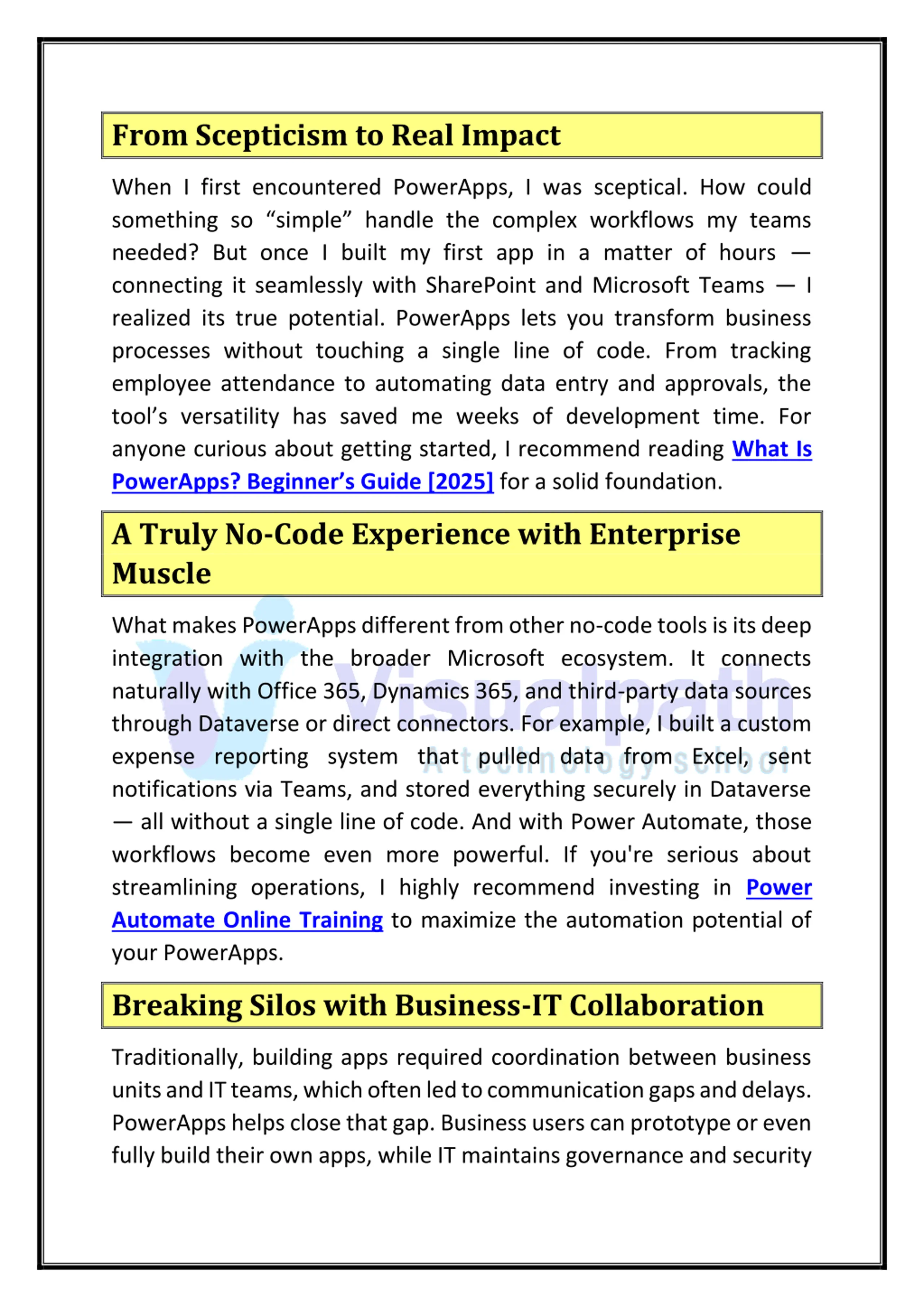 From Scepticism to Real Impact When I first encountered PowerApps, I was sceptical. How could something so simple handle the complex workflows my teams needed? But once I built my first app in a matter of hours connecting it seamlessly with SharePoint and Microsoft Teams I realized its true potential. PowerApps lets you transform business processes without touching a single line of code. From tracking employee attendance to automating data entry and approvals, the tool s versatility has saved me weeks of development time. For anyone curious about getting started, I recommend reading What Is PowerApps? Beginner s Guide [2025] for a solid foundation. A Truly No-Code Experience with Enterprise Muscle What makes PowerApps different from other no-code tools is its deep integration with the broader Microsoft ecosystem. It connects naturally with Office 365, Dynamics 365, and third-party data sources through Dataverse or direct connectors. For example, I built a custom expense reporting system that pulled data from Excel, sent notifications via Teams, and stored everything securely in Dataverse all without a single line of code. And with Power Automate, those workflows become even more powerful. If you're serious about streamlining operations, I highly recommend investing in Power Automate Online Training to maximize the automation potential of your PowerApps. Breaking Silos with Business-IT Collaboration Traditionally, building apps required coordination between business units and IT teams, which often led to communication gaps and delays. PowerApps helps close that gap. Business users can prototype or even fully build their own apps, while IT maintains governance and security