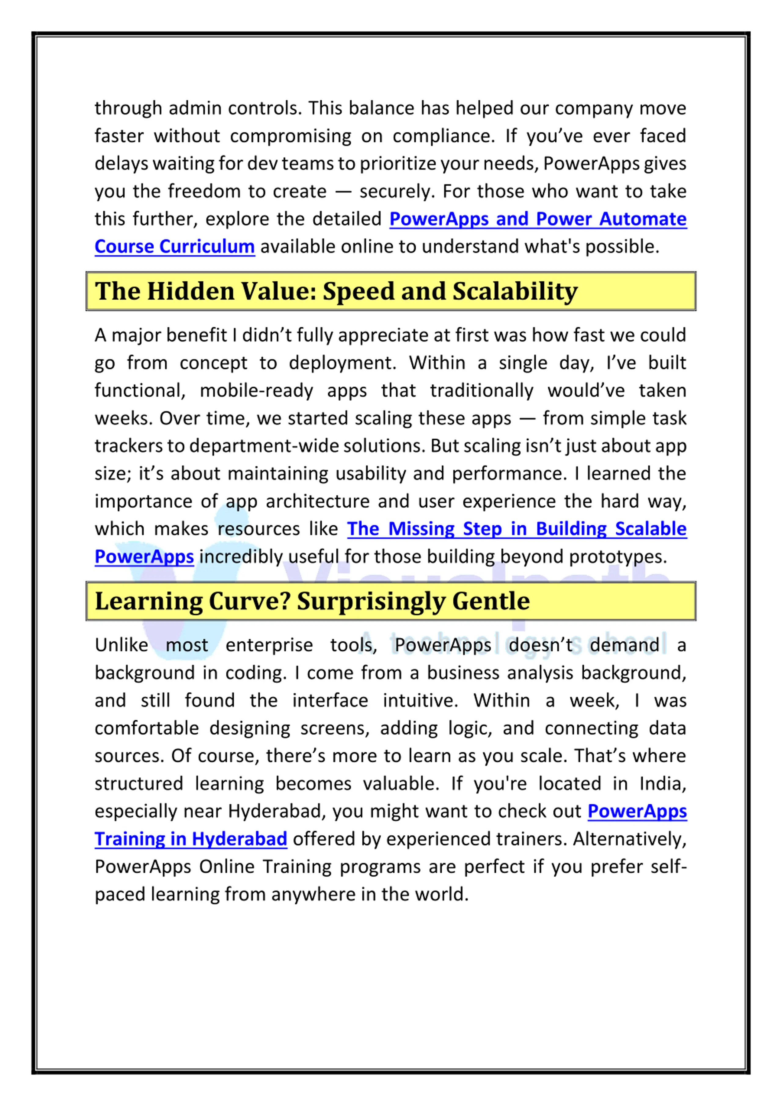 through admin controls. This balance has helped our company move faster without compromising on compliance. If you ve ever faced delays waiting for dev teams to prioritize your needs, PowerApps gives you the freedom to create securely. For those who want to take this further, explore the detailed PowerApps and Power Automate Course Curriculum available online to understand what's possible. The Hidden Value: Speed and Scalability A major benefit I didn t fully appreciate at first was how fast we could go from concept to deployment. Within a single day, I ve built functional, mobile-ready apps that traditionally would ve taken weeks. Over time, we started scaling these apps from simple task trackers to department-wide solutions. But scaling isn t just about app size; it s about maintaining usability and performance. I learned the importance of app architecture and user experience the hard way, which makes resources like The Missing Step in Building Scalable PowerApps incredibly useful for those building beyond prototypes. Learning Curve? Surprisingly Gentle Unlike most enterprise tools, PowerApps doesn t demand a background in coding. I come from a business analysis background, and still found the interface intuitive. Within a week, I was comfortable designing screens, adding logic, and connecting data sources. Of course, there s more to learn as you scale. That s where structured learning becomes valuable. If you're located in India, especially near Hyderabad, you might want to check out PowerApps Training in Hyderabad offered by experienced trainers. Alternatively, PowerApps Online Training programs are perfect if you prefer self- paced learning from anywhere in the world.