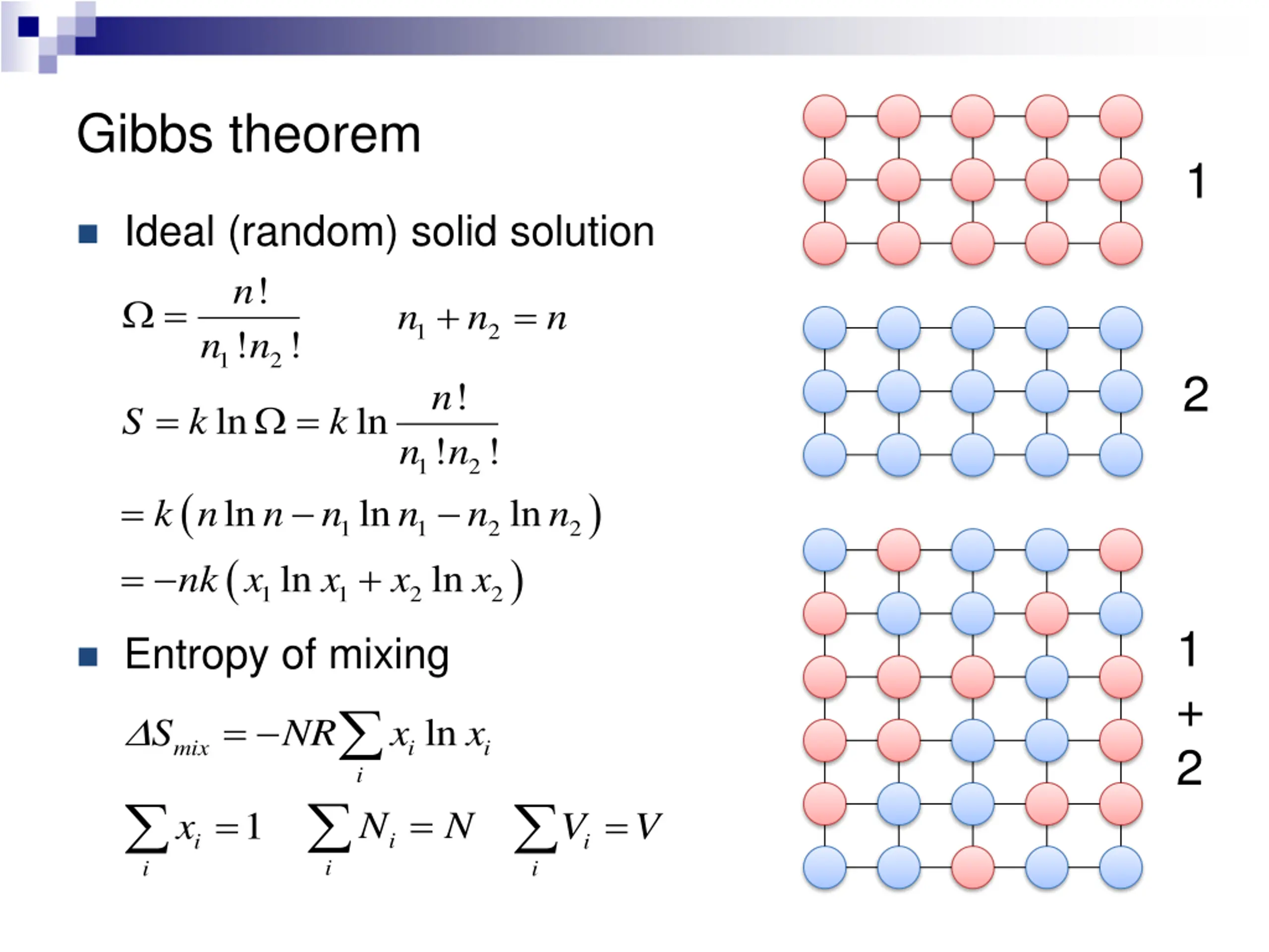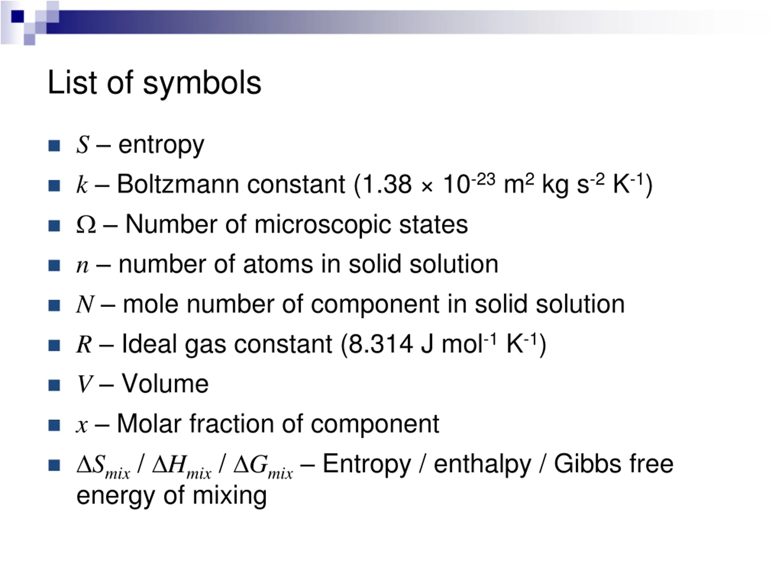 List of symbols S entropy k Boltzmann constant (1.38 10-23m2kg s-2K-1) Number of microscopic states n number of atoms in solid solution N mole number of component in solid solution R Ideal gas constant (8.314 J mol-1 K-1) V Volume x Molar fraction of component Smix / Hmix / Gmix Entropy / enthalpy / Gibbs free energy of mixing