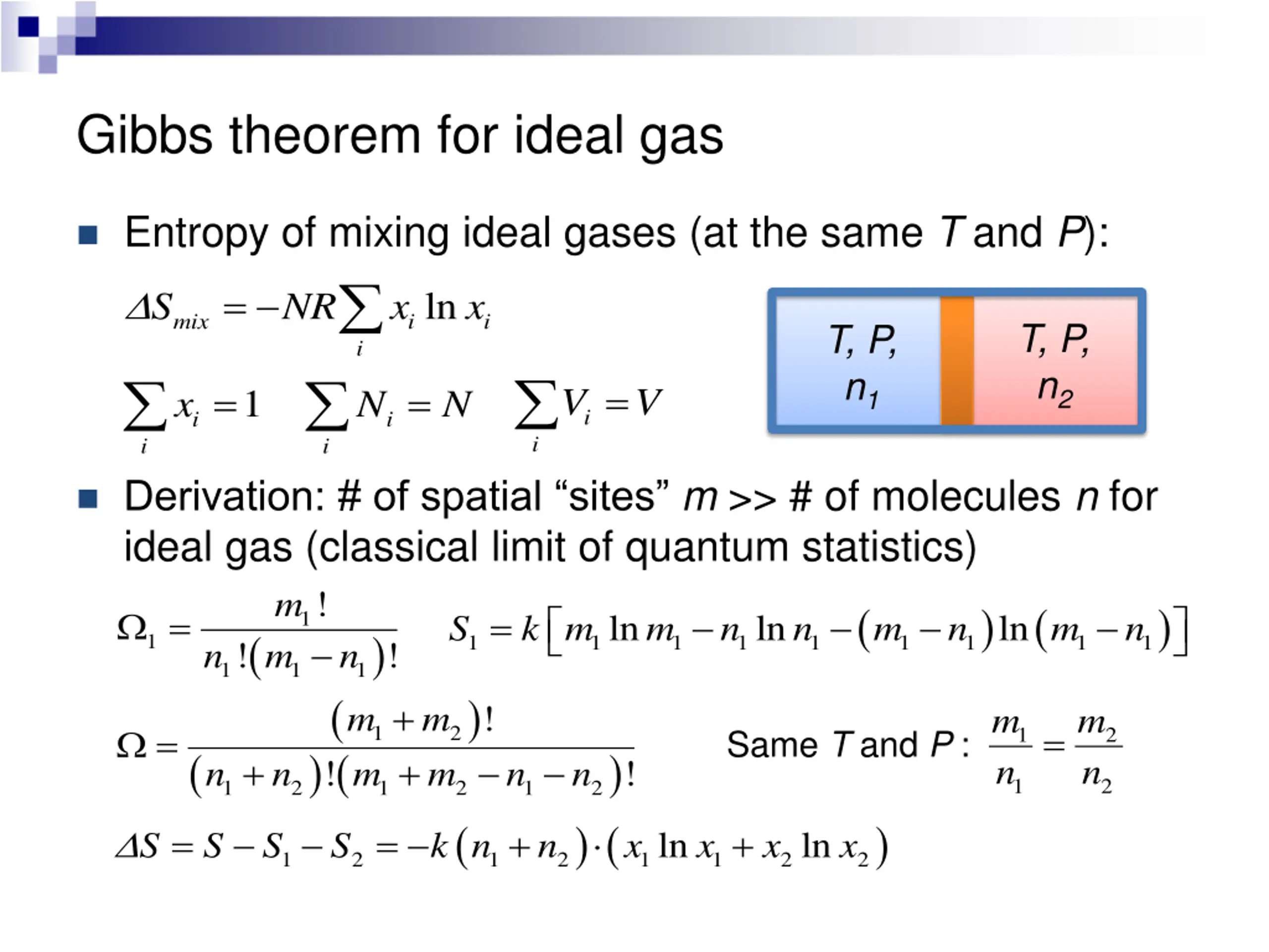 Gibbs theorem for ideal gas Entropy of mixing ideal gases (at the same T and P): i i i = ln S NR x x mix i i T, P, n2 T, P, n1 i = x = = V V 1 N N i i i Derivation: # of spatial sites m >> # of molecules n for ideal gas (classical limit of quantum statistics) ! ! ! n m n ( ) ( ) ( ) 1 2 1 2 1 2 ! n n m m n n + + ( ) ( 1 2 1 2 S S S S k n n = = + m ( ) ( ) = k m = 1 ln ln ln S m n n m n m n ( ) 1 1 1 1 1 1 1 1 1 1 1 1 1 + ! m m m n m n = = 1 2 1 2 Same T and P : ! 1 2 ) + ln ln x x x x 1 1 2 2