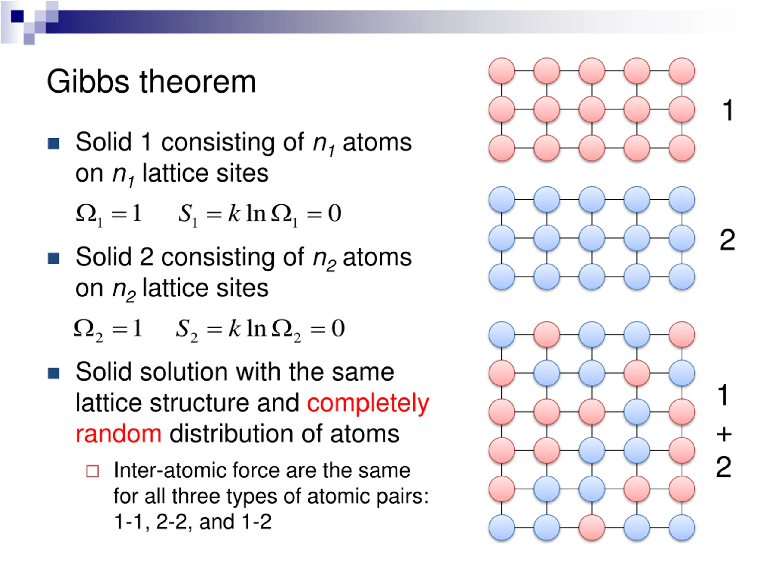 Gibbs theorem 1 Solid 1 consisting of n1 atoms on n1 lattice sites 1 = 1 S k = = ln 0 1 1 2 Solid 2 consisting of n2 atoms on n2 lattice sites 1 = 2 S k = = ln 0 2 2 Solid solution with the same lattice structure and completely random distribution of atoms 1 + 2 Inter-atomic force are the same for all three types of atomic pairs: 1-1, 2-2, and 1-2