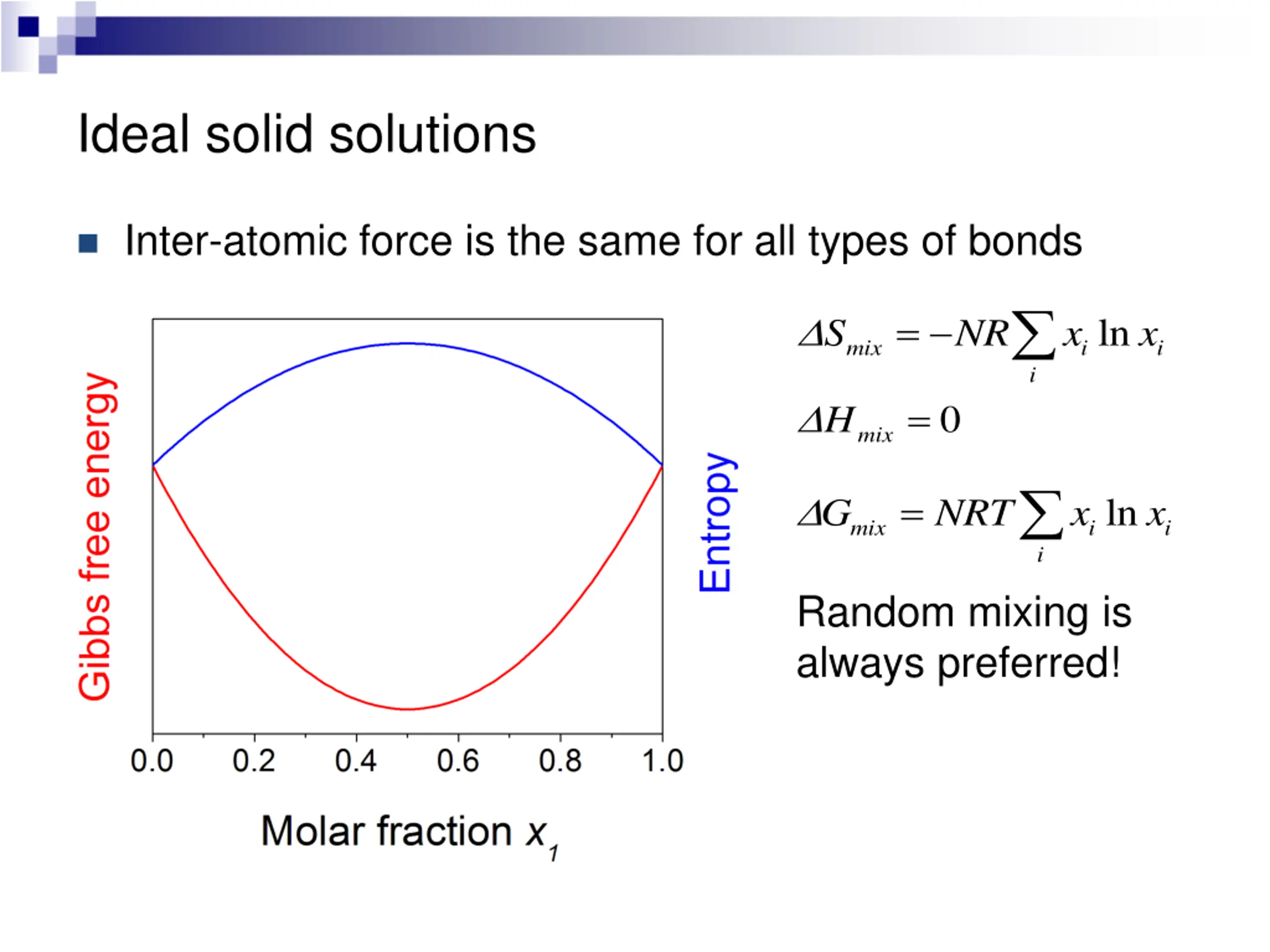 Ideal solid solutions Inter-atomic force is the same for all types of bonds = ln S NR x x mix i i i = 0 H mix = ln G NRT x x mix i i i Random mixing is always preferred!