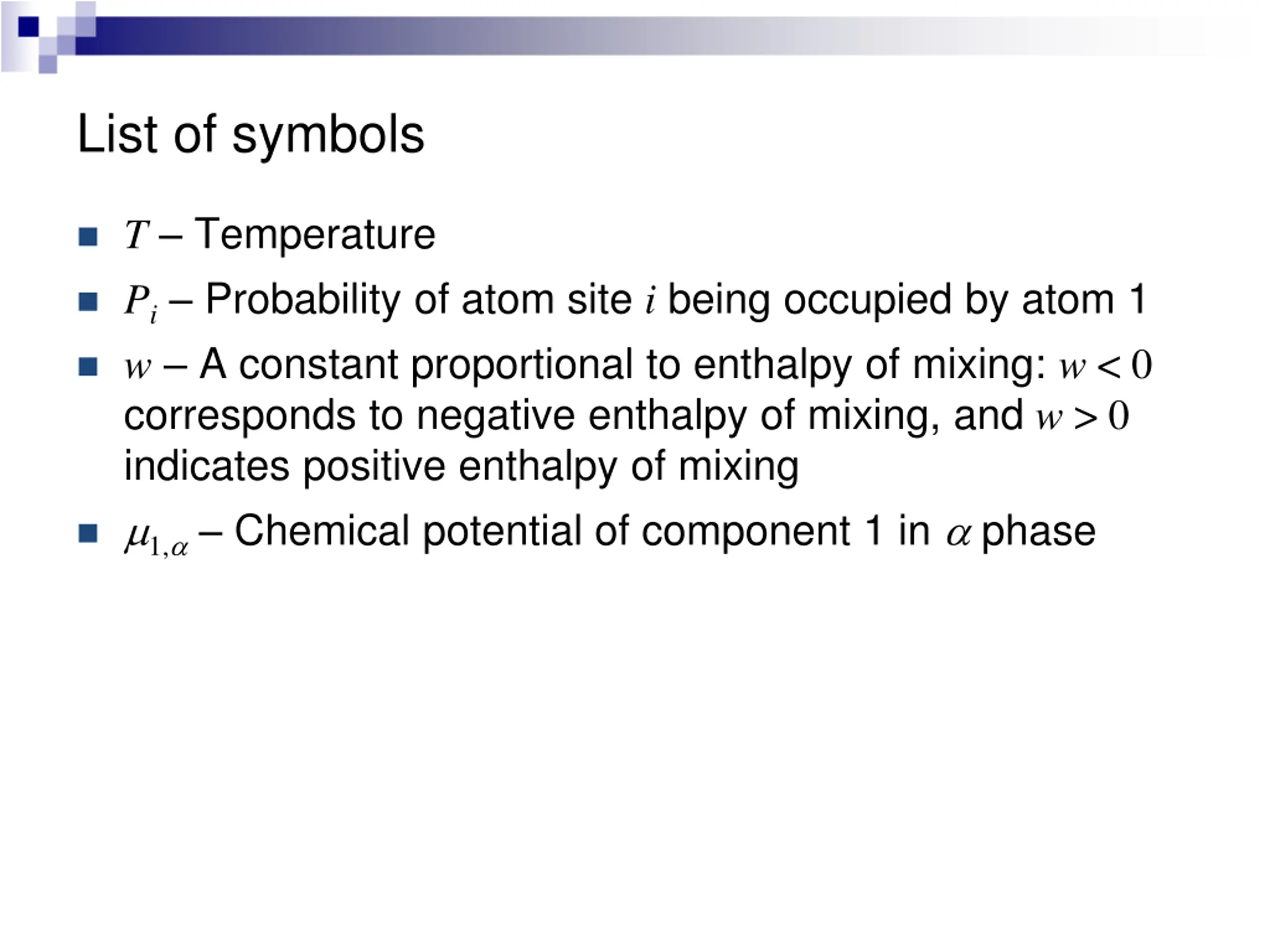 List of symbols T Temperature Pi Probability of atom site i being occupied by atom 1 w A constant proportional to enthalpy of mixing: w < 0 corresponds to negative enthalpy of mixing, and w > 0 indicates positive enthalpy of mixing 1, Chemical potential of component 1 in phase
