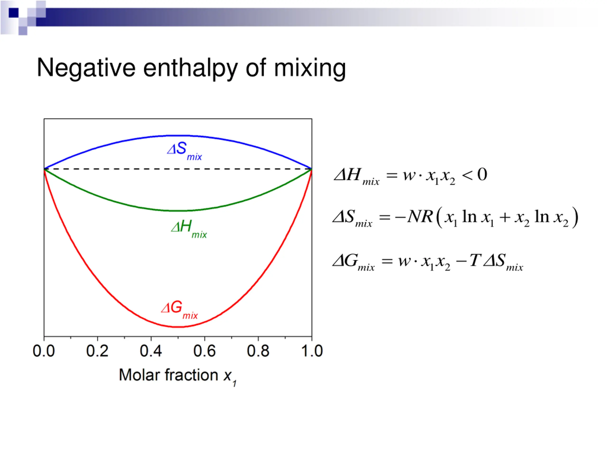 Negative enthalpy of mixing = w x x 0 H 1 2 mix ( ) = + ln ln S NR x x x x 1 1 2 2 mix = w x x T S G 1 2 mix mix