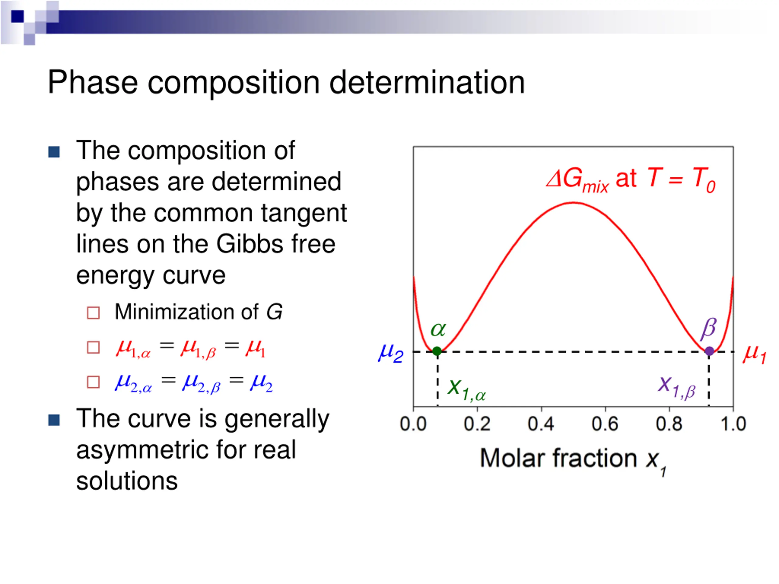 Phase composition determination The composition of phases are determined by the common tangent lines on the Gibbs free energy curve Gmixat T = T0 Minimization of G = = = = 2 1 1, 1, 1 x1, x1, 2, 2, 2 The curve is generally asymmetric for real solutions