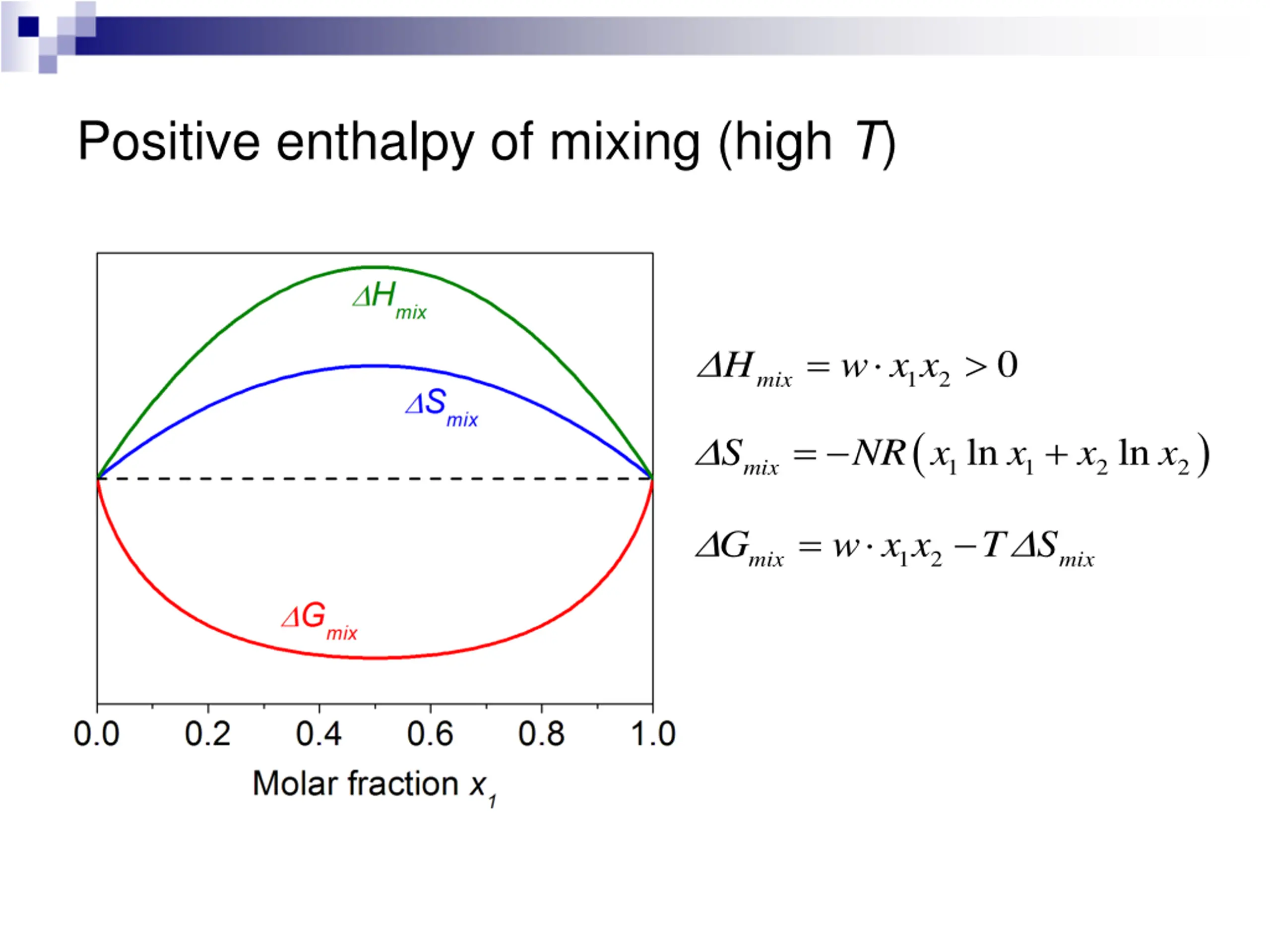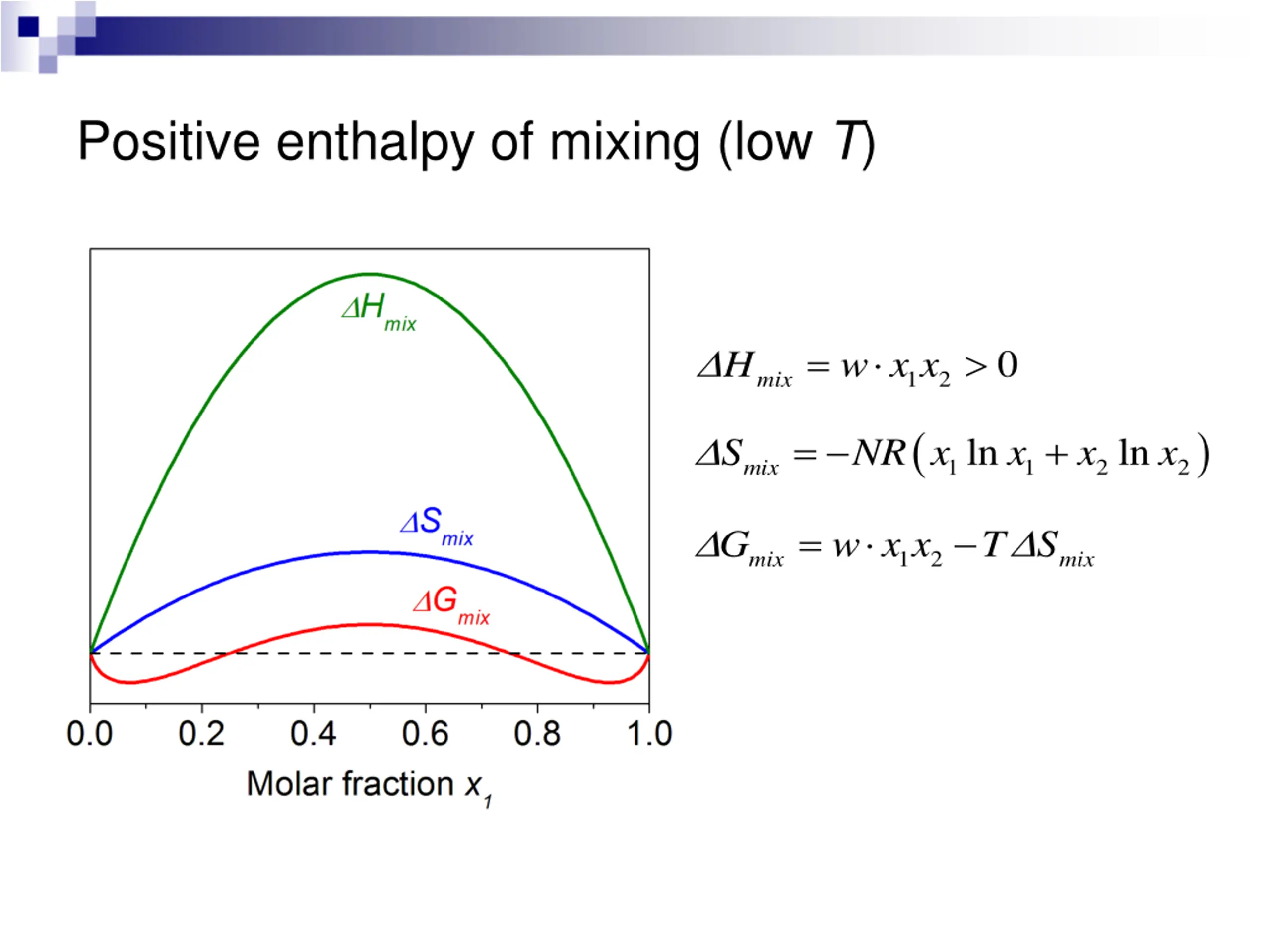 Positive enthalpy of mixing (high T) = w x x 0 H 1 2 mix ( ) = + ln ln S NR x x x x 1 1 2 2 mix = w x x T S G 1 2 mix mix