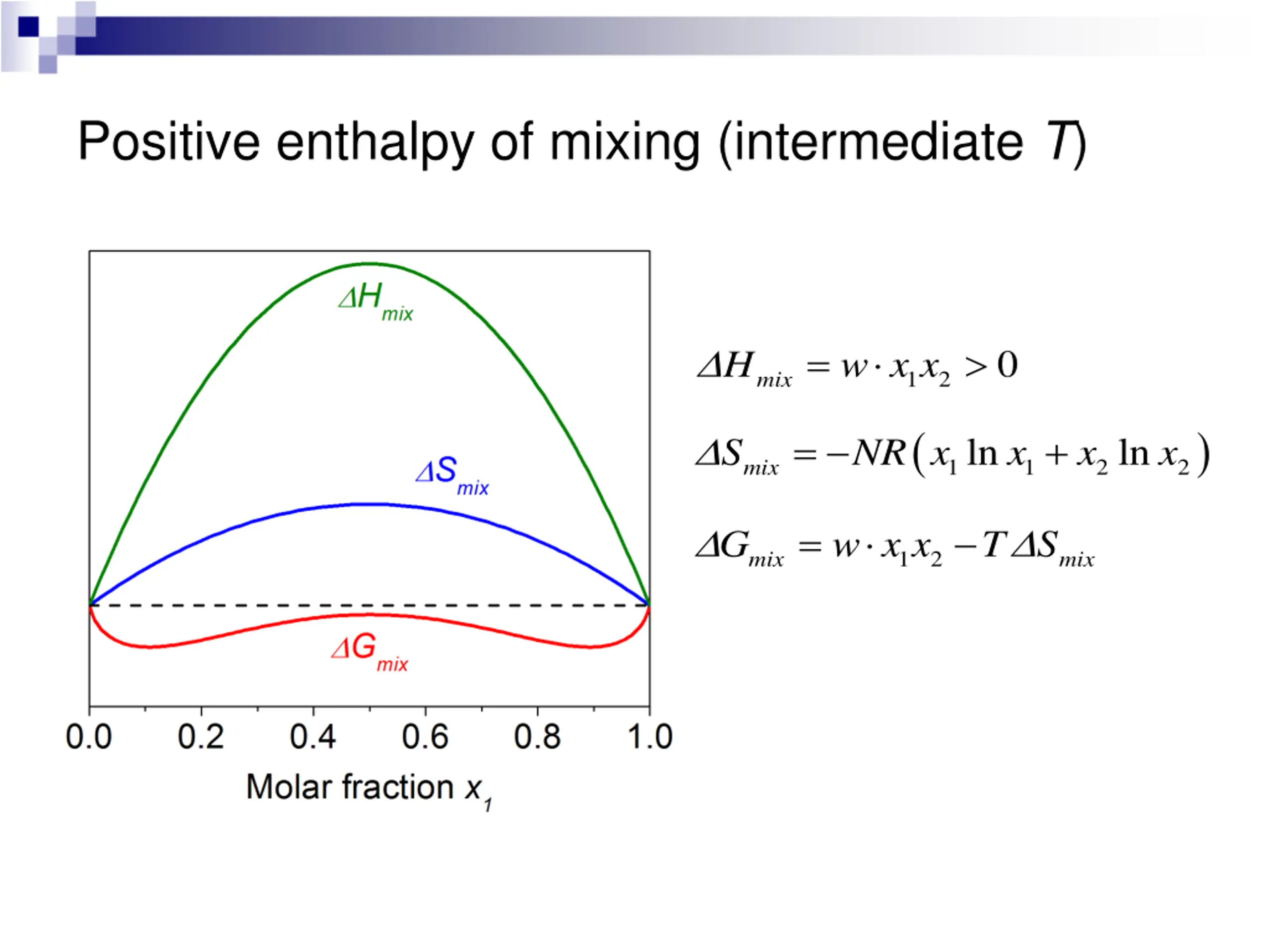 Positive enthalpy of mixing (intermediate T) = w x x 0 H 1 2 mix ( ) = + ln ln S NR x x x x 1 1 2 2 mix = w x x T S G 1 2 mix mix
