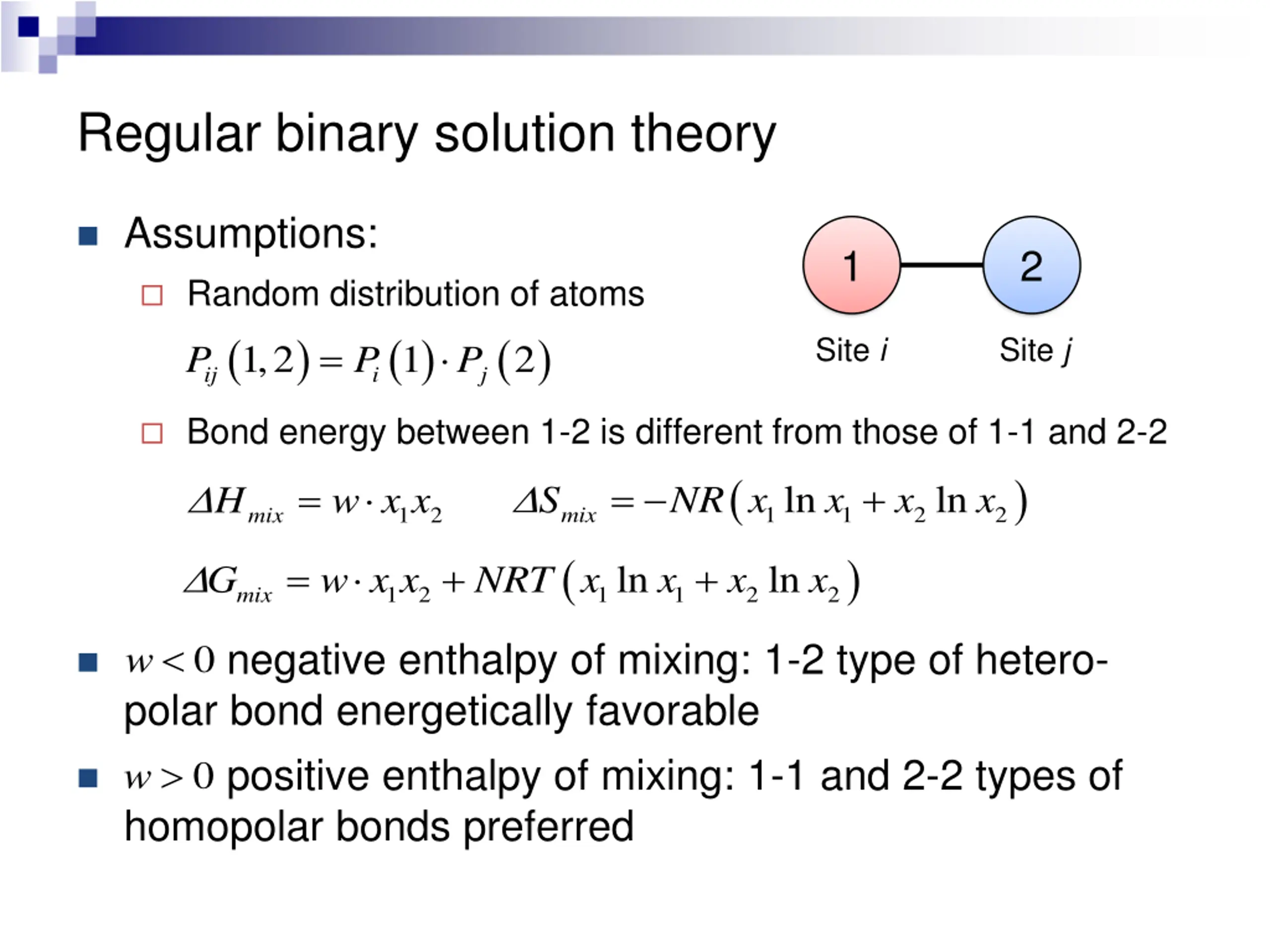 Regular binary solution theory Assumptions: 1 2 Random distribution of atoms ( ) ( ) 1,2 ij i P P = ( ) 2 Site i Site j 1 P j Bond energy between 1-2 is different from those of 1-1 and 2-2 ( ) = + = w x x ln ln S NR x x x x H 1 1 2 2 mix 1 2 mix ( ) = w x x + + ln ln G NRT x x x x 1 2 1 1 2 2 mix w negative enthalpy of mixing: 1-2 type of hetero- polar bond energetically favorable positive enthalpy of mixing: 1-1 and 2-2 types of homopolar bonds preferred 0 w 0