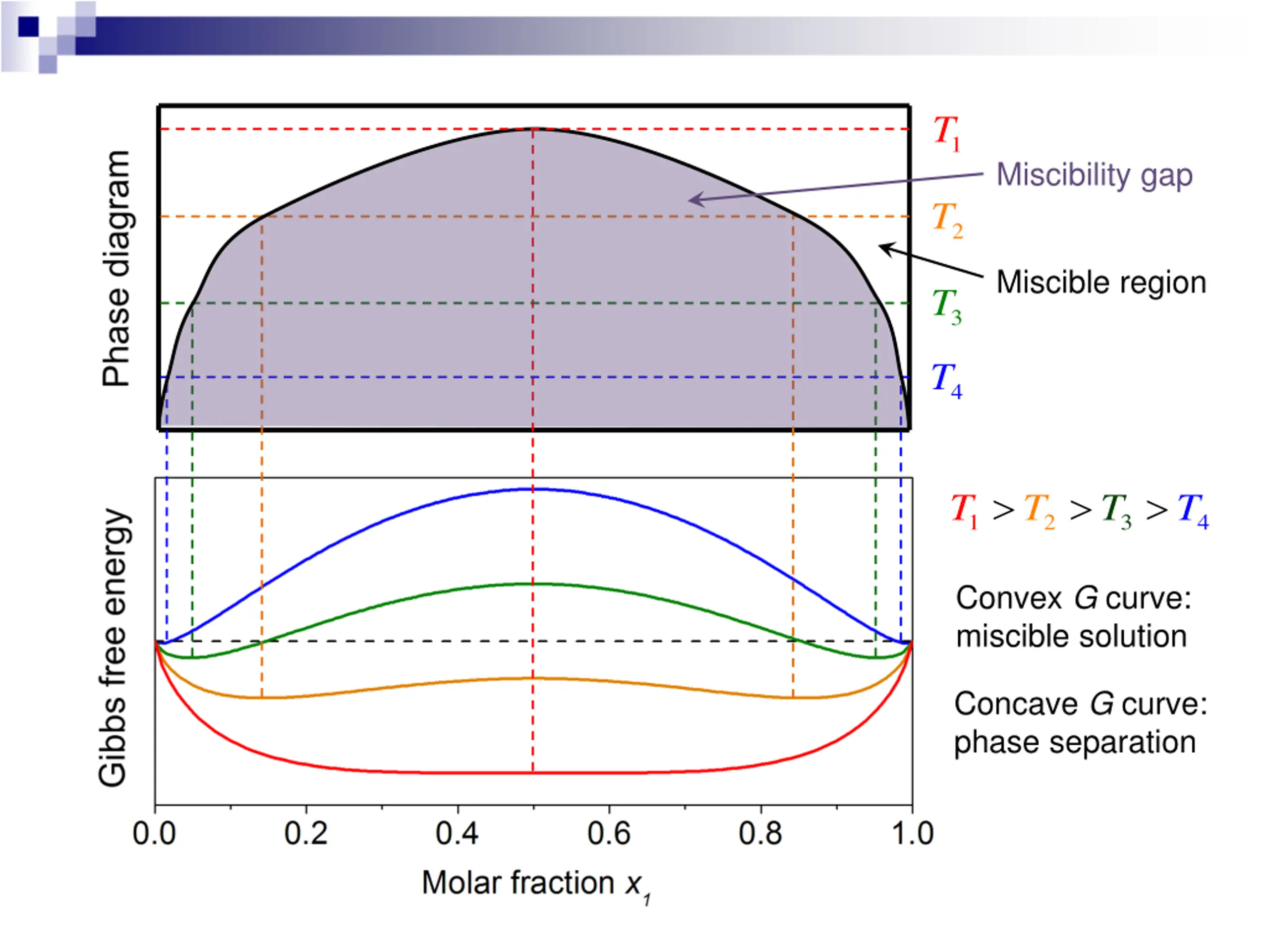1 T Miscibility gap 2 T Miscible region 3 T 4 T T T T T 1 2 3 4 Convex G curve: miscible solution Concave G curve: phase separation
