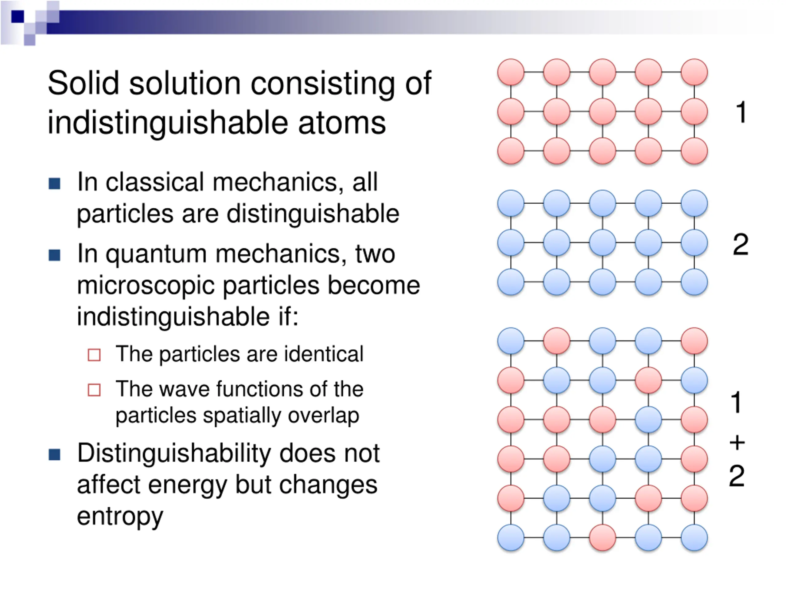 Solid solution consisting of indistinguishable atoms 1 In classical mechanics, all particles are distinguishable In quantum mechanics, two microscopic particles become indistinguishable if: 2 The particles are identical The wave functions of the particles spatially overlap Distinguishability does not affect energy but changes entropy 1 + 2