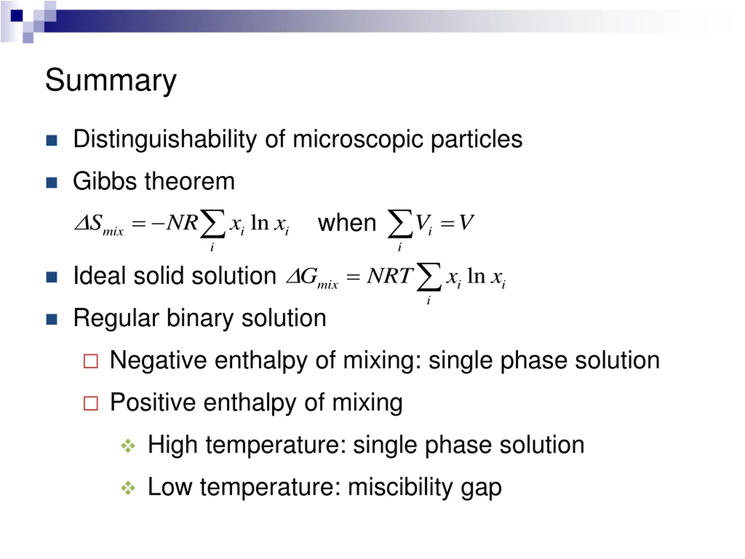 Summary Distinguishability of microscopic particles Gibbs theorem = = when ln S NR x x V V mix i i i i i = Ideal solid solution ln G NRT x x mix i i i Regular binary solution Negative enthalpy of mixing: single phase solution Positive enthalpy of mixing High temperature: single phase solution Low temperature: miscibility gap