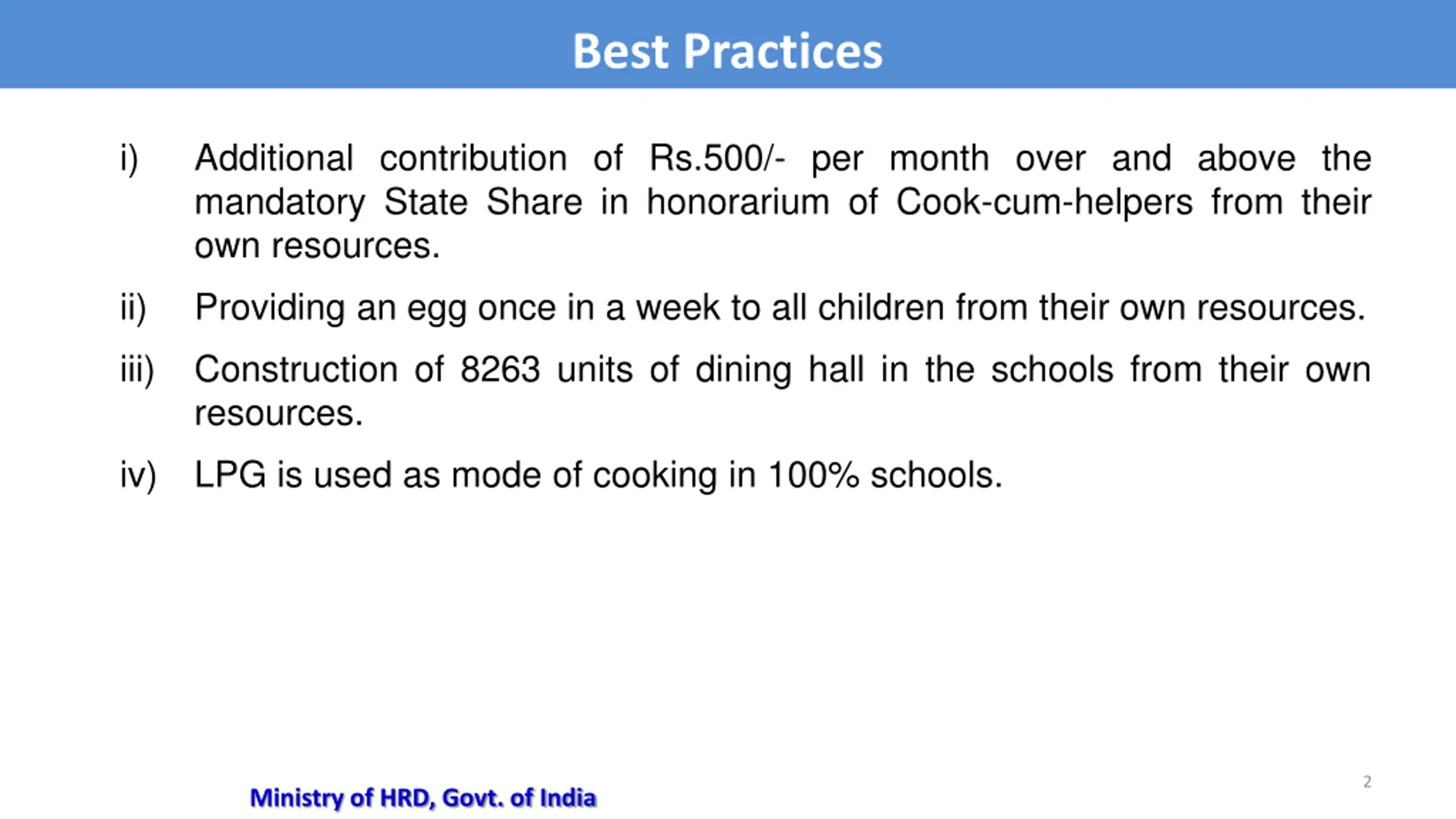 Best Practices i) Additional contribution of Rs.500/- per month over and above the mandatory State Share in honorarium of Cook-cum-helpers from their own resources. ii) Providing an egg once in a week to all children from their own resources. iii) Construction of 8263 units of dining hall in the schools from their own resources. iv) LPG is used as mode of cooking in 100% schools. 2 Ministry of HRD, Govt. of India