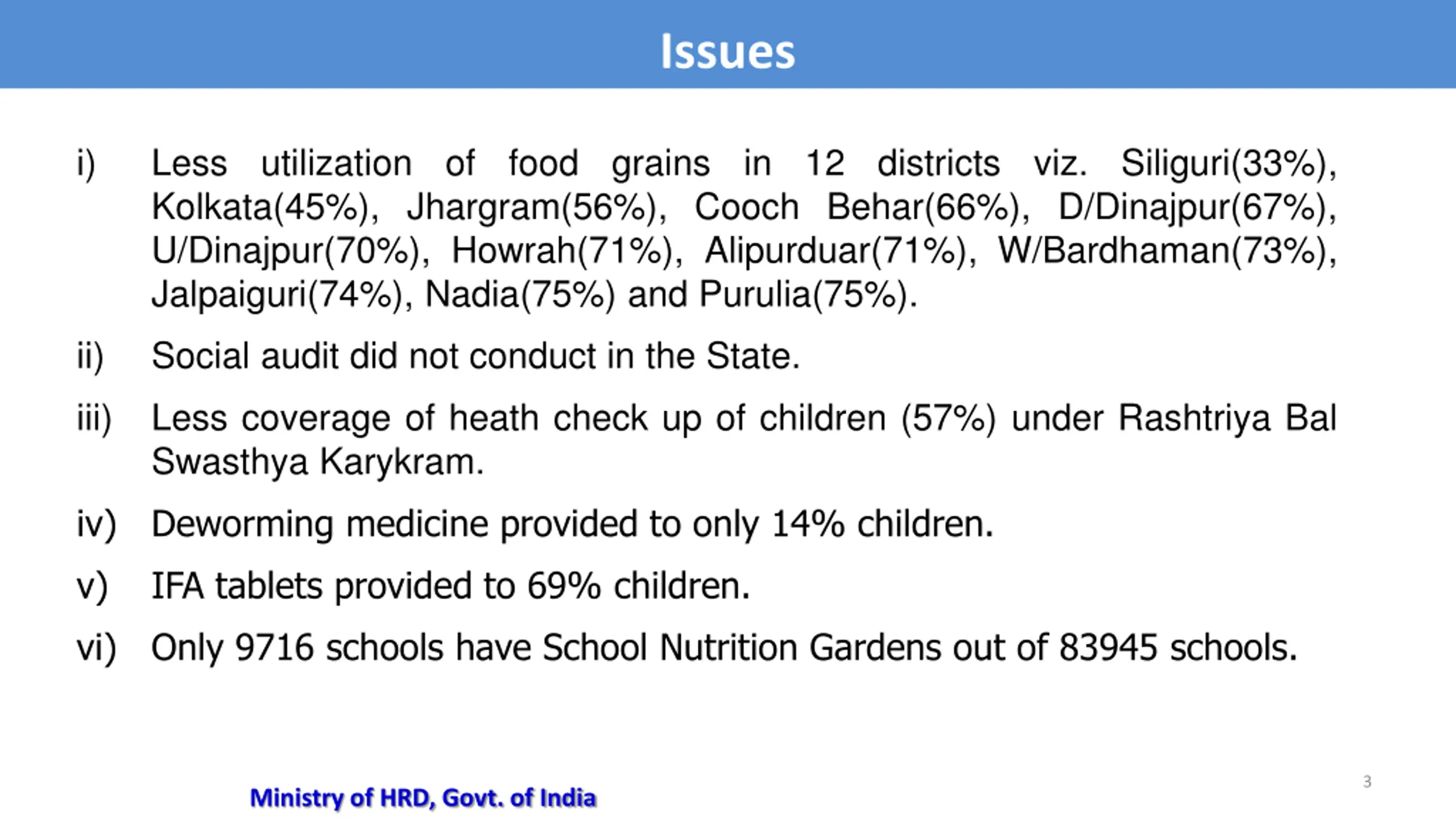Issues i) Less utilization of food grains in 12 districts viz. Siliguri(33%), Kolkata(45%), Jhargram(56%), Cooch Behar(66%), D/Dinajpur(67%), U/Dinajpur(70%), Howrah(71%), Alipurduar(71%), W/Bardhaman(73%), Jalpaiguri(74%), Nadia(75%) and Purulia(75%). ii) Social audit did not conduct in the State. iii) Less coverage of heath check up of children (57%) under Rashtriya Bal Swasthya Karykram. Deworming medicine provided to only 14% children. IFA tablets provided to 69% children. Only 9716 schools have School Nutrition Gardens out of 83945 schools. iv) v) vi) 3 Ministry of HRD, Govt. of India