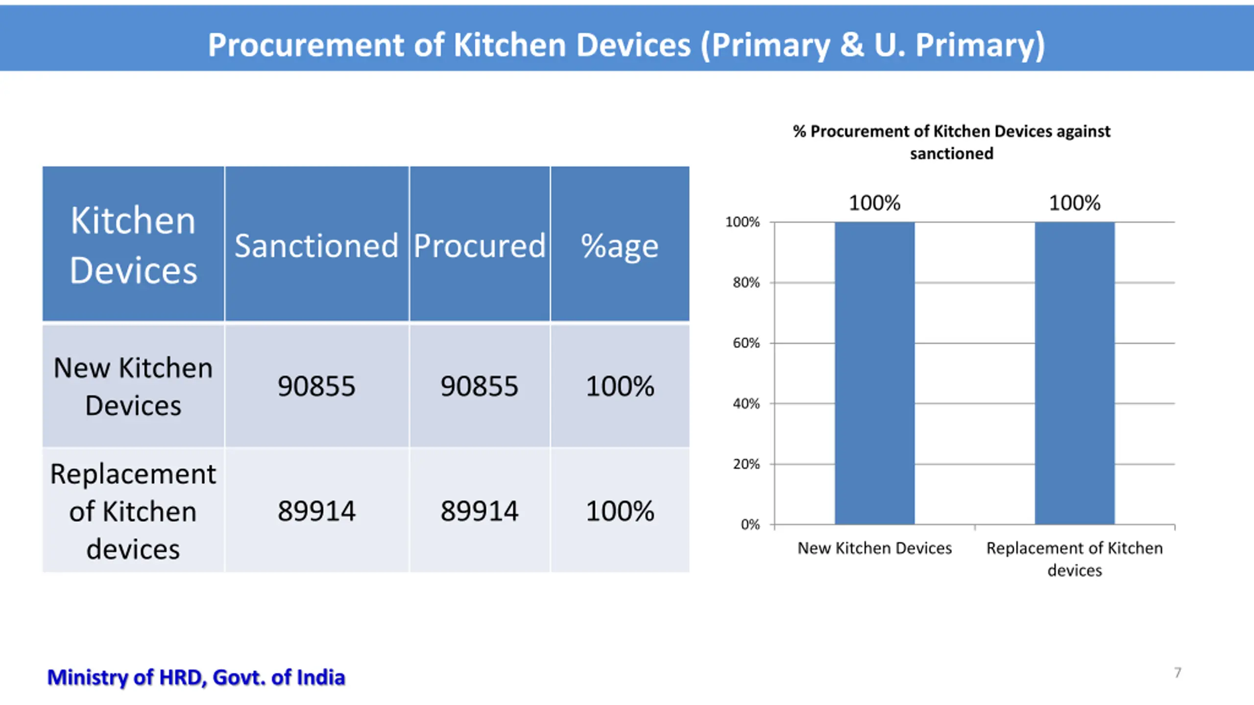 Procurement of Kitchen Devices (Primary & U. Primary) % Procurement of Kitchen Devices against sanctioned 100% 100% Kitchen Devices 100% Sanctioned Procured %age 80% 60% New Kitchen Devices 90855 90855 100% 40% 20% Replacement of Kitchen devices 89914 89914 100% 0% New Kitchen Devices Replacement of Kitchen devices 7 Ministry of HRD, Govt. of India