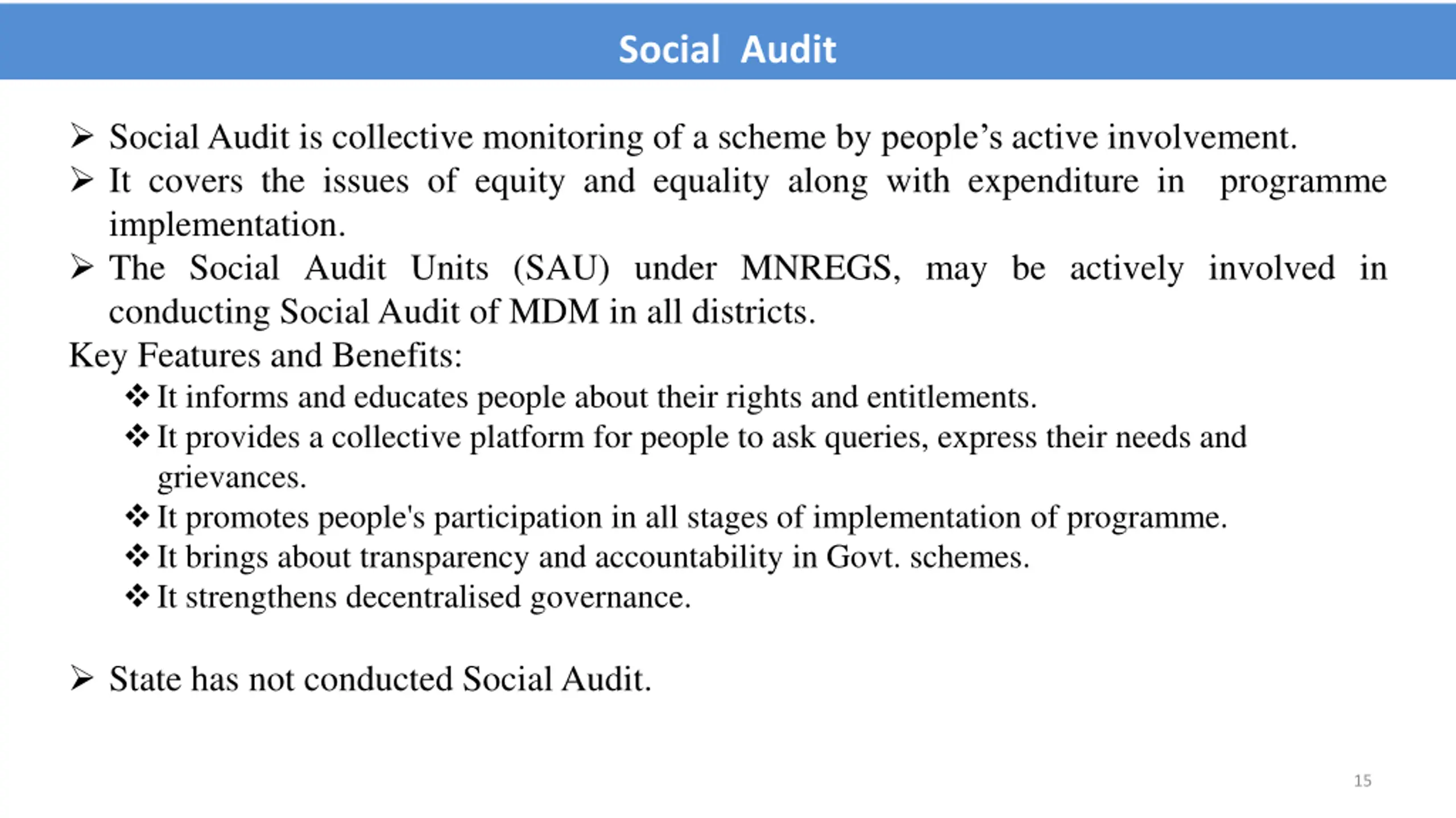 Social Audit Social Audit is collective monitoring of a scheme by people s active involvement. It covers the issues of equity and equality along with expenditure in programme implementation. The Social Audit Units (SAU) under MNREGS, may be actively involved in conducting Social Audit of MDM in all districts. Key Features and Benefits: It informs and educates people about their rights and entitlements. It provides a collective platform for people to ask queries, express their needs and grievances. It promotes people's participation in all stages of implementation of programme. It brings about transparency and accountability in Govt. schemes. It strengthens decentralised governance. State has not conducted Social Audit. 15