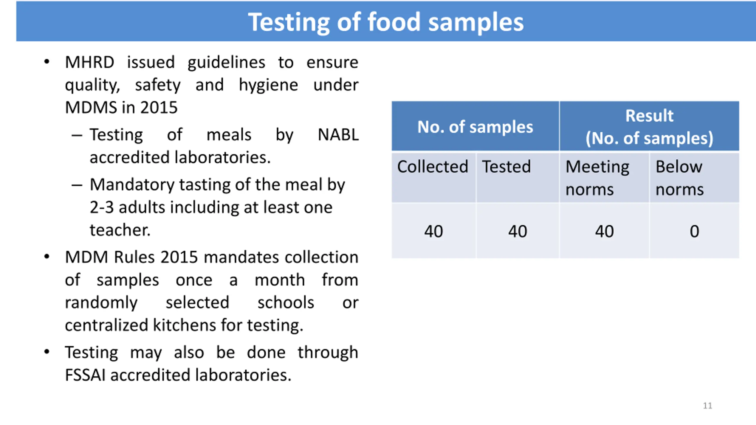 Testing of food samples MHRD issued guidelines to ensure quality, safety and hygiene under MDMS in 2015 Testing of accredited laboratories. Mandatory tasting of the meal by 2-3 adults including at least one teacher. MDM Rules 2015 mandates collection of samples once a month from randomly selected centralized kitchens for testing. Testing may also be done through FSSAI accredited laboratories. Result No. of samples meals by NABL (No. of samples) Meeting norms Collected Tested Below norms 40 40 40 0 schools or 11