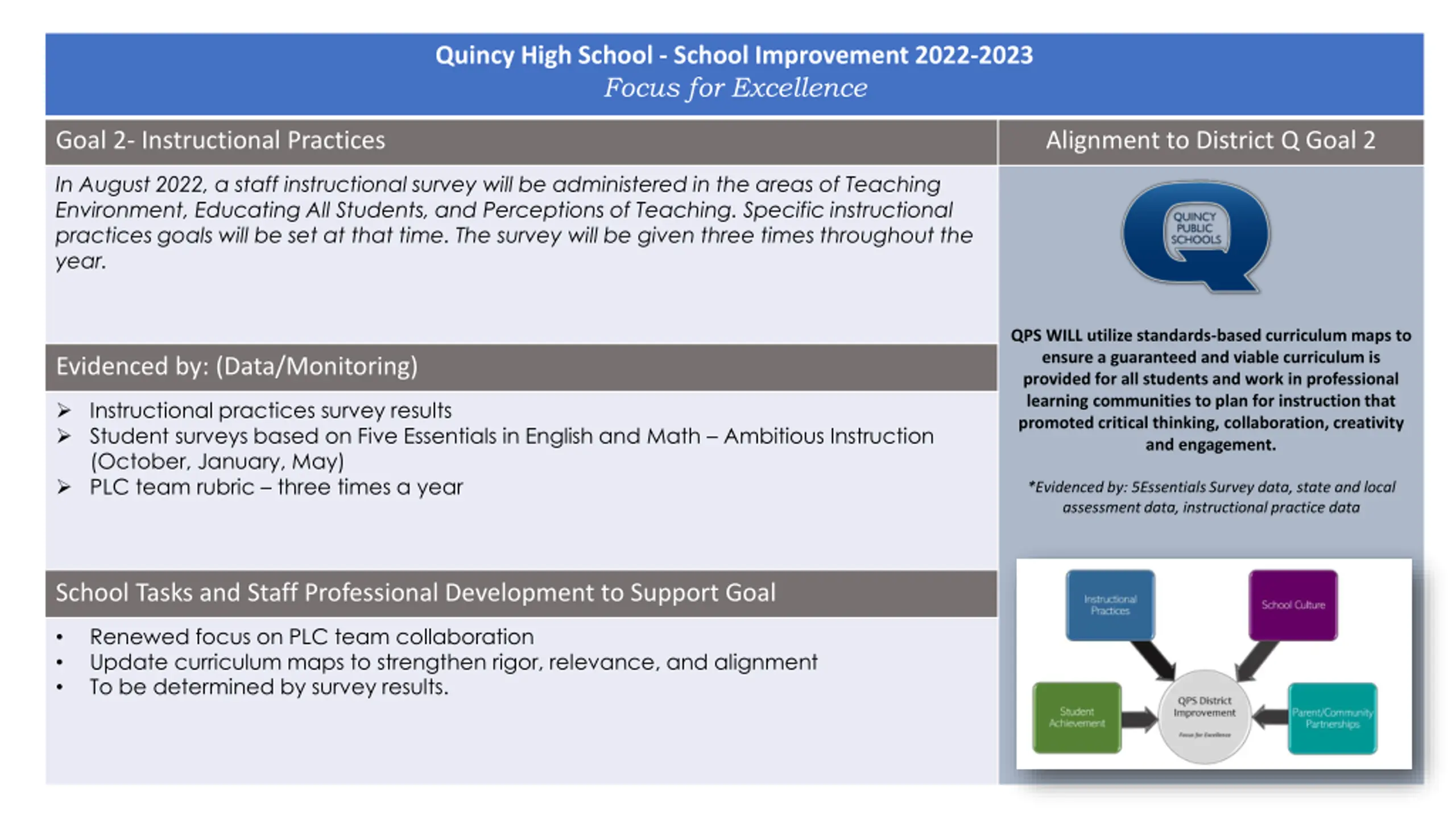 Quincy High School - School Improvement 2022-2023 Focus for Excellence Goal 2- Instructional Practices Alignment to District Q Goal 2 In August 2022, a staff instructional survey will be administered in the areas of Teaching Environment, Educating All Students, and Perceptions of Teaching. Specific instructional practices goals will be set at that time. The survey will be given three times throughout the year. QPS WILL utilize standards-based curriculum maps to ensure a guaranteed and viable curriculum is provided for all students and work in professional learning communities to plan for instruction that promoted critical thinking, collaboration, creativity and engagement. Evidenced by: (Data/Monitoring) Instructional practices survey results Student surveys based on Five Essentials in English and Math Ambitious Instruction (October, January, May) PLC team rubric three times a year *Evidenced by: 5Essentials Survey data, state and local assessment data, instructional practice data School Tasks and Staff Professional Development to Support Goal Renewed focus on PLC team collaboration Update curriculum maps to strengthen rigor, relevance, and alignment To be determined by survey results.