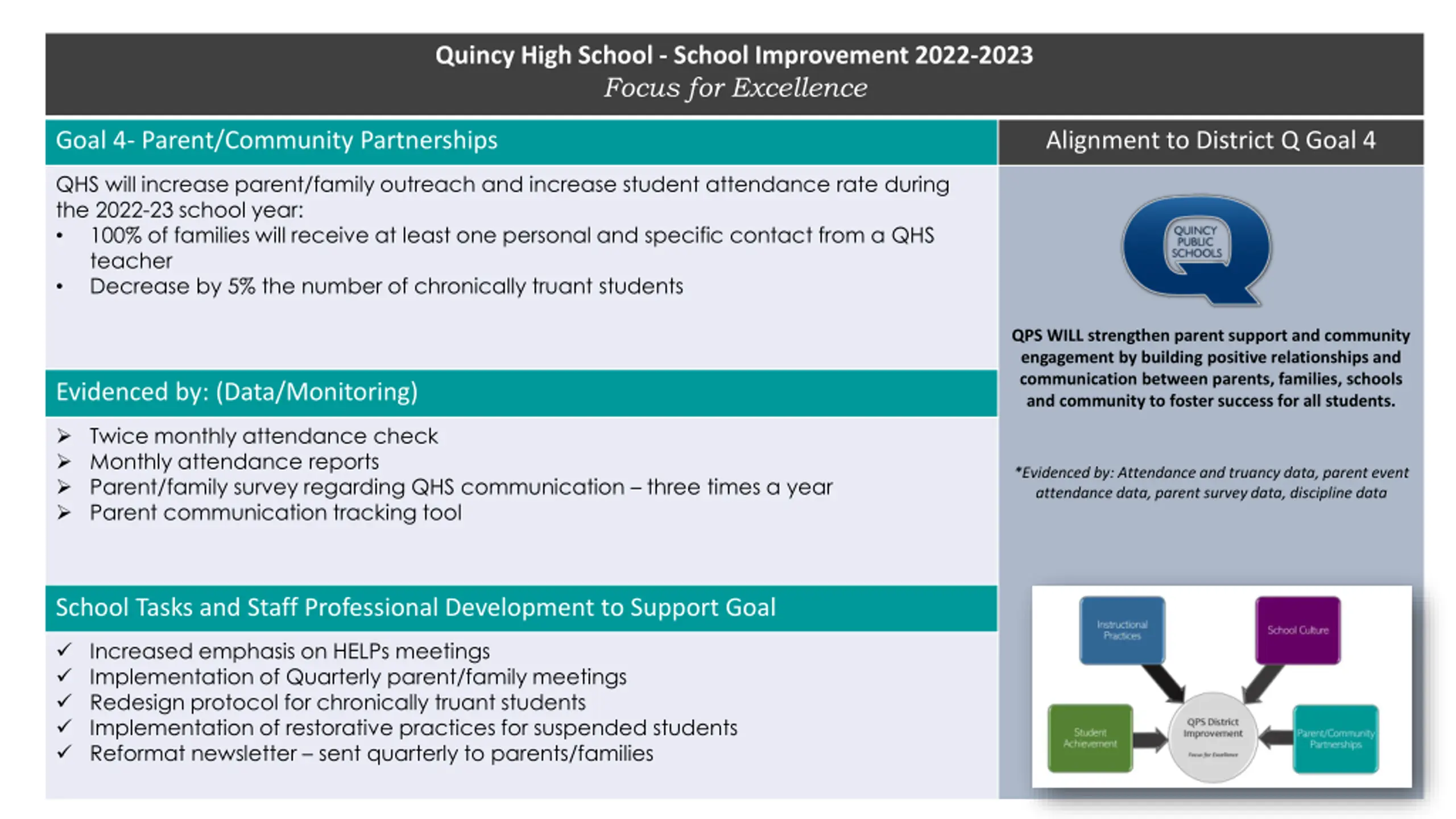 Quincy High School - School Improvement 2022-2023 Focus for Excellence Goal 4- Parent/Community Partnerships Alignment to District Q Goal 4 QHS will increase parent/family outreach and increase student attendance rate during the 2022-23 school year: 100% of families will receive at least one personal and specific contact from a QHS teacher Decrease by 5% the number of chronically truant students QPS WILL strengthen parent support and community engagement by building positive relationships and communication between parents, families, schools and community to foster success for all students. Evidenced by: (Data/Monitoring) Twice monthly attendance check Monthly attendance reports Parent/family survey regarding QHS communication three times a year Parent communication tracking tool *Evidenced by: Attendance and truancy data, parent event attendance data, parent survey data, discipline data School Tasks and Staff Professional Development to Support Goal Increased emphasis on HELPs meetings Implementation of Quarterly parent/family meetings Redesign protocol for chronically truant students Implementation of restorative practices for suspended students Reformat newsletter sent quarterly to parents/families