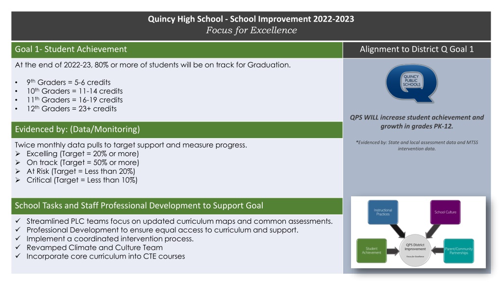Quincy High School - School Improvement 2022-2023 Focus for Excellence Goal 1- Student Achievement Alignment to District Q Goal 1 At the end of 2022-23, 80% or more of students will be on track for Graduation. 9thGraders = 5-6 credits 10thGraders = 11-14 credits 11thGraders = 16-19 credits 12thGraders = 23+ credits QPS WILL increase student achievement and growth in grades PK-12. Evidenced by: (Data/Monitoring) Twice monthly data pulls to target support and measure progress. Excelling (Target = 20% or more) On track (Target = 50% or more) At Risk (Target = Less than 20%) Critical (Target = Less than 10%) *Evidenced by: State and local assessment data and MTSS intervention data. School Tasks and Staff Professional Development to Support Goal Streamlined PLC teams focus on updated curriculum maps and common assessments. Professional Development to ensure equal access to curriculum and support. Implement a coordinated intervention process. Revamped Climate and Culture Team Incorporate core curriculum into CTE courses
