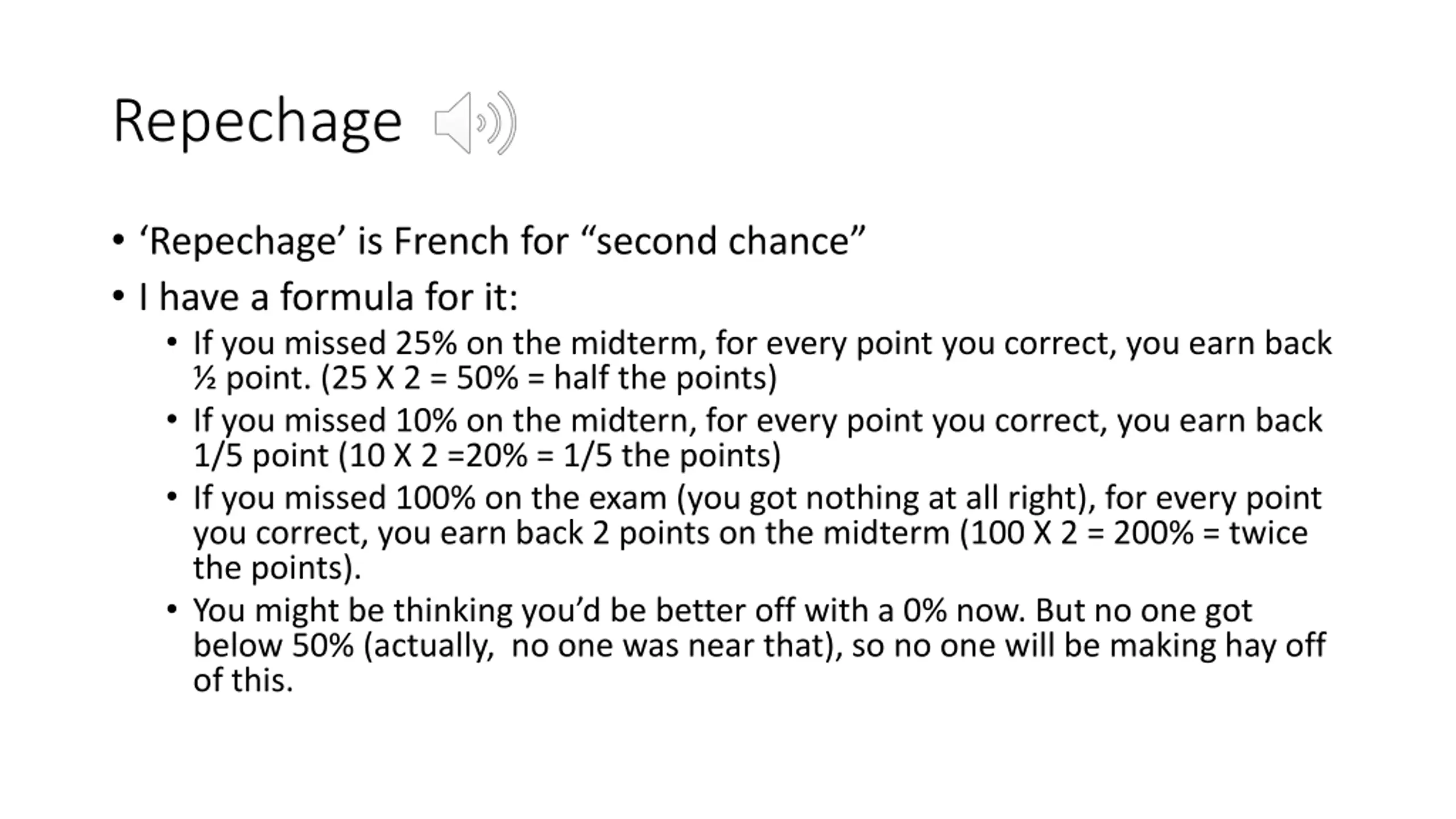 Repechage Repechage is French for second chance I have a formula for it: If you missed 25% on the midterm, for every point you correct, you earn back point. (25 X 2 = 50% = half the points) If you missed 10% on the midtern, for every point you correct, you earn back 1/5 point (10 X 2 =20% = 1/5 the points) If you missed 100% on the exam (you got nothing at all right), for every point you correct, you earn back 2 points on the midterm (100 X 2 = 200% = twice the points). You might be thinking you d be better off with a 0% now. But no one got below 50% (actually, no one was near that), so no one will be making hay off of this.