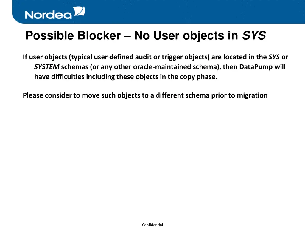 Possible Blocker No User objects in SYS If user objects (typical user defined audit or trigger objects) are located in the SYS or SYSTEM schemas (or any other oracle-maintained schema), then DataPump will have difficulties including these objects in the copy phase. Please consider to move such objects to a different schema prior to migration Confidential