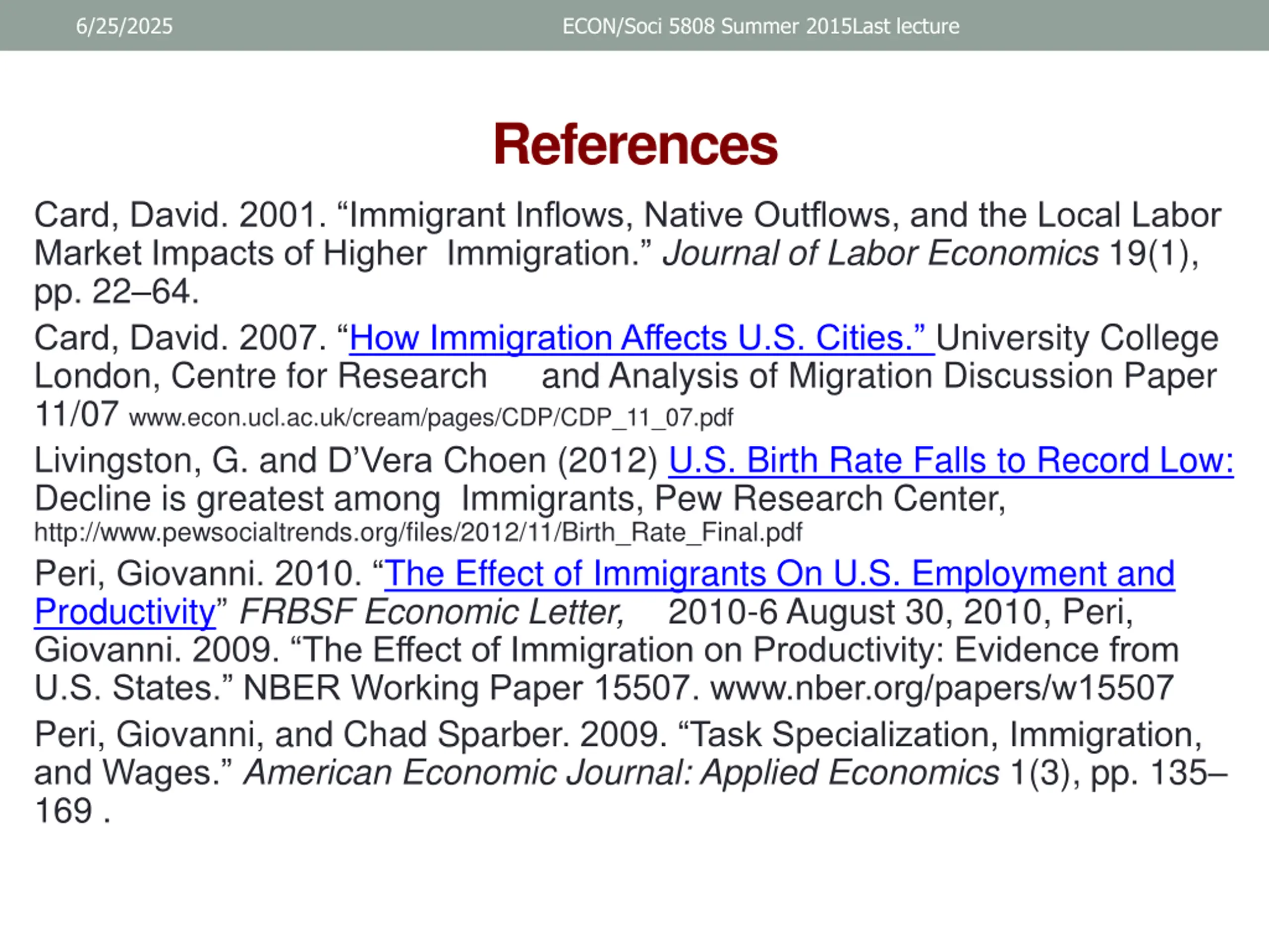 6/25/2025 ECON/Soci 5808 Summer 2015Last lecture References Card, David. 2001. Immigrant Inflows, Native Outflows, and the Local Labor Market Impacts of Higher Immigration. Journal of Labor Economics 19(1), pp. 22 64. Card, David. 2007. How Immigration Affects U.S. Cities. University College London, Centre for Research and Analysis of Migration Discussion Paper 11/07 www.econ.ucl.ac.uk/cream/pages/CDP/CDP_11_07.pdf Livingston, G. and D Vera Choen (2012) U.S. Birth Rate Falls to Record Low: Decline is greatest among Immigrants, Pew Research Center, http://www.pewsocialtrends.org/files/2012/11/Birth_Rate_Final.pdf Peri, Giovanni. 2010. The Effect of Immigrants On U.S. Employment and Productivity FRBSF Economic Letter, Giovanni. 2009. The Effect of Immigration on Productivity: Evidence from U.S. States. NBER Working Paper 15507. www.nber.org/papers/w15507 Peri, Giovanni, and Chad Sparber. 2009. Task Specialization, Immigration, and Wages. American Economic Journal: Applied Economics 1(3), pp. 135 169 . 2010-6 August 30, 2010, Peri, 29