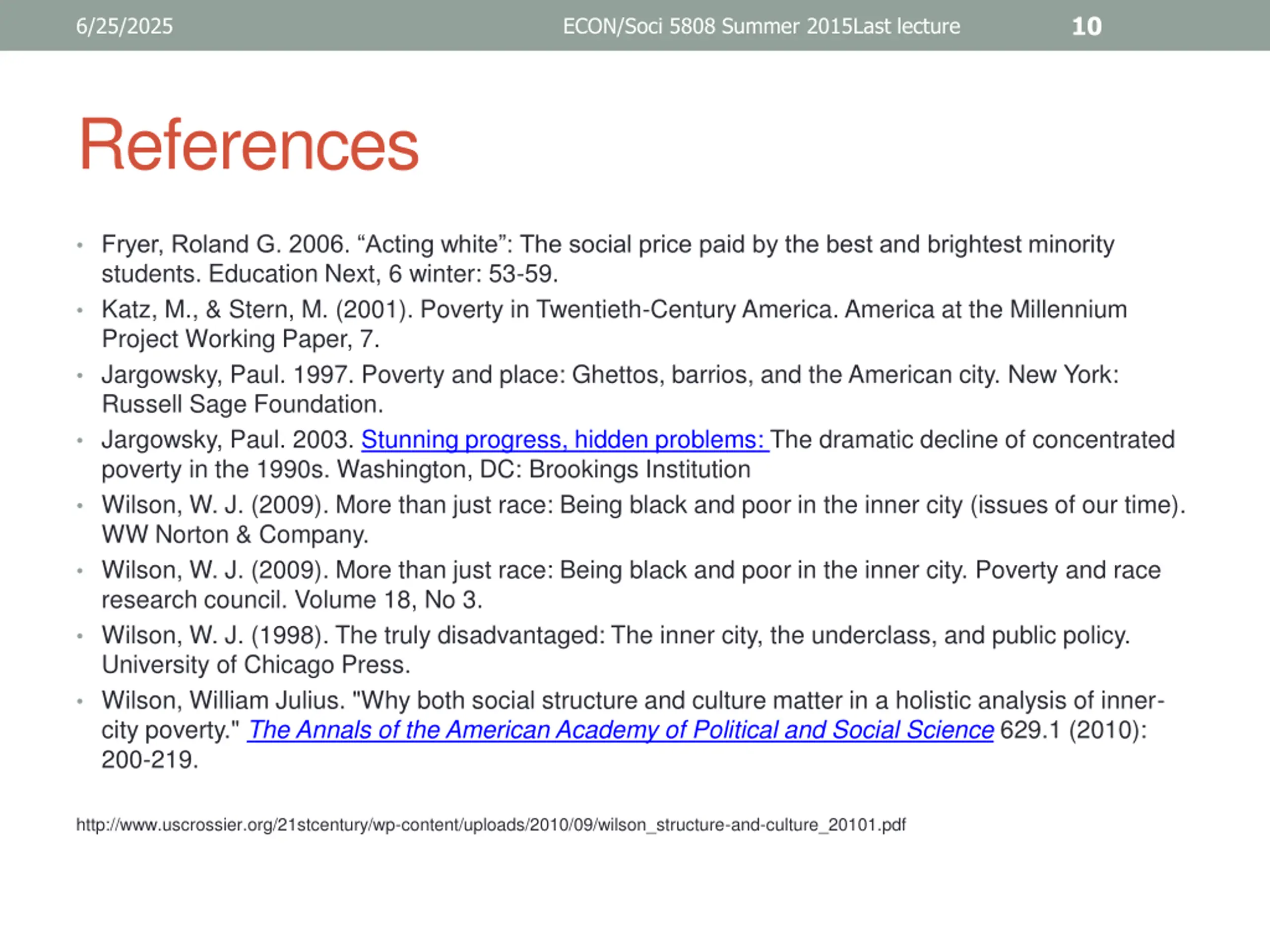 10 6/25/2025 ECON/Soci 5808 Summer 2015Last lecture References Fryer, Roland G. 2006. Acting white : The social price paid by the best and brightest minority students. Education Next, 6 winter: 53-59. Katz, M., & Stern, M. (2001). Poverty in Twentieth-Century America. America at the Millennium Project Working Paper, 7. Jargowsky, Paul. 1997. Poverty and place: Ghettos, barrios, and the American city. New York: Russell Sage Foundation. Jargowsky, Paul. 2003. Stunning progress, hidden problems: The dramatic decline of concentrated poverty in the 1990s. Washington, DC: Brookings Institution Wilson, W. J. (2009). More than just race: Being black and poor in the inner city (issues of our time). WW Norton & Company. Wilson, W. J. (2009). More than just race: Being black and poor in the inner city. Poverty and race research council. Volume 18, No 3. Wilson, W. J. (1998). The truly disadvantaged: The inner city, the underclass, and public policy. University of Chicago Press. Wilson, William Julius. "Why both social structure and culture matter in a holistic analysis of inner- city poverty." The Annals of the American Academy of Political and Social Science 629.1 (2010): 200-219. http://www.uscrossier.org/21stcentury/wp-content/uploads/2010/09/wilson_structure-and-culture_20101.pdf