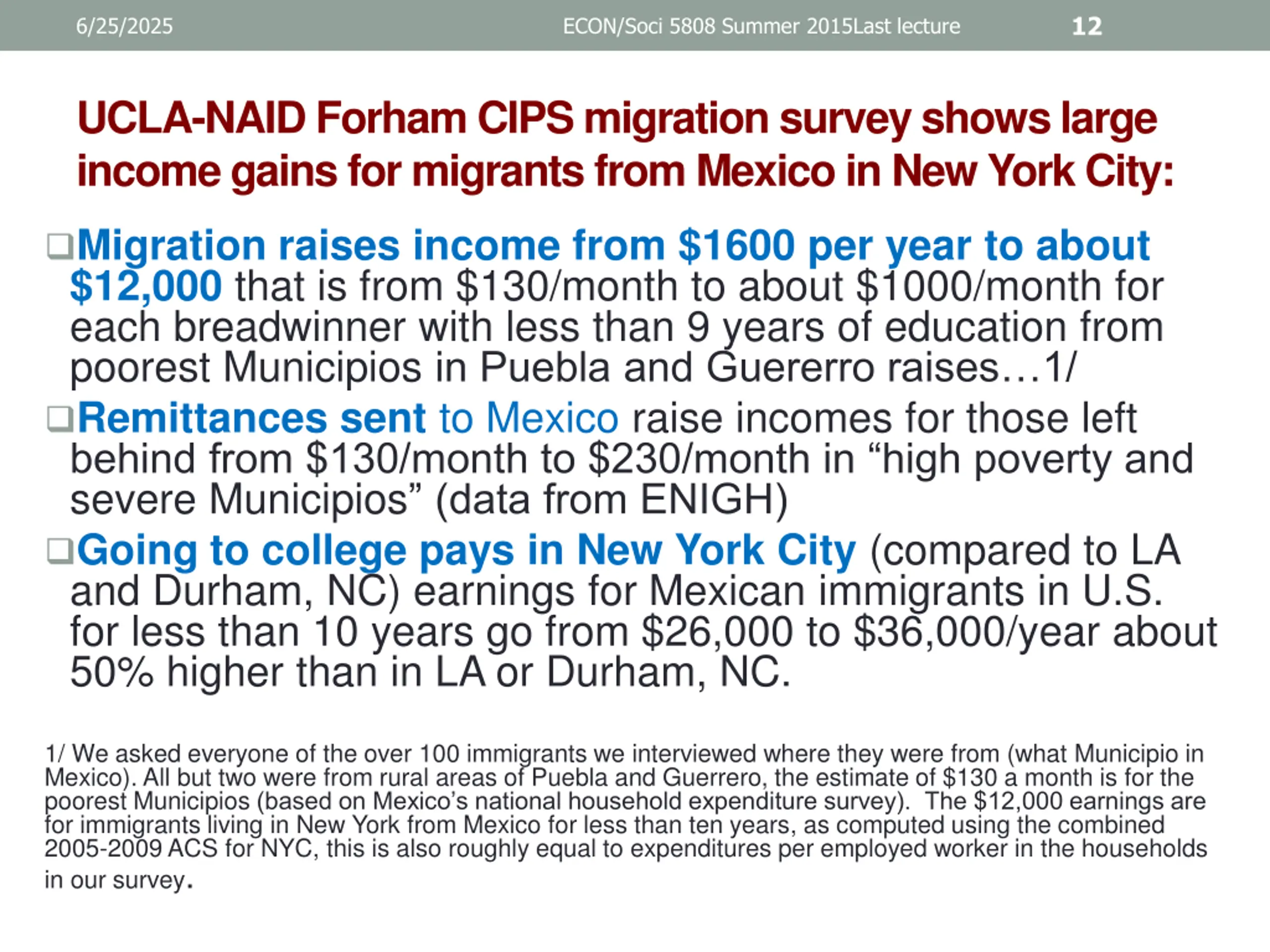 28 6/25/2025 ECON/Soci 5808 Summer 2015Last lecture UCLA-NAID Forham CIPS migration survey shows large income gains for migrants from Mexico in New York City: Migration raises income from $1600 per year to about $12,000 that is from $130/month to about $1000/month for each breadwinner with less than 9 years of education from poorest Municipios in Puebla and Guererro raises 1/ Remittances sent to Mexico raise incomes for those left behind from $130/month to $230/month in high poverty and severe Municipios (data from ENIGH) Going to college pays in New York City (compared to LA and Durham, NC) earnings for Mexican immigrants in U.S. for less than 10 years go from $26,000 to $36,000/year about 50% higher than in LA or Durham, NC. 1/ We asked everyone of the over 100 immigrants we interviewed where they were from (what Municipio in Mexico). All but two were from rural areas of Puebla and Guerrero, the estimate of $130 a month is for the poorest Municipios (based on Mexico s national household expenditure survey). The $12,000 earnings are for immigrants living in New York from Mexico for less than ten years, as computed using the combined 2005-2009 ACS for NYC, this is also roughly equal to expenditures per employed worker in the households in our survey.