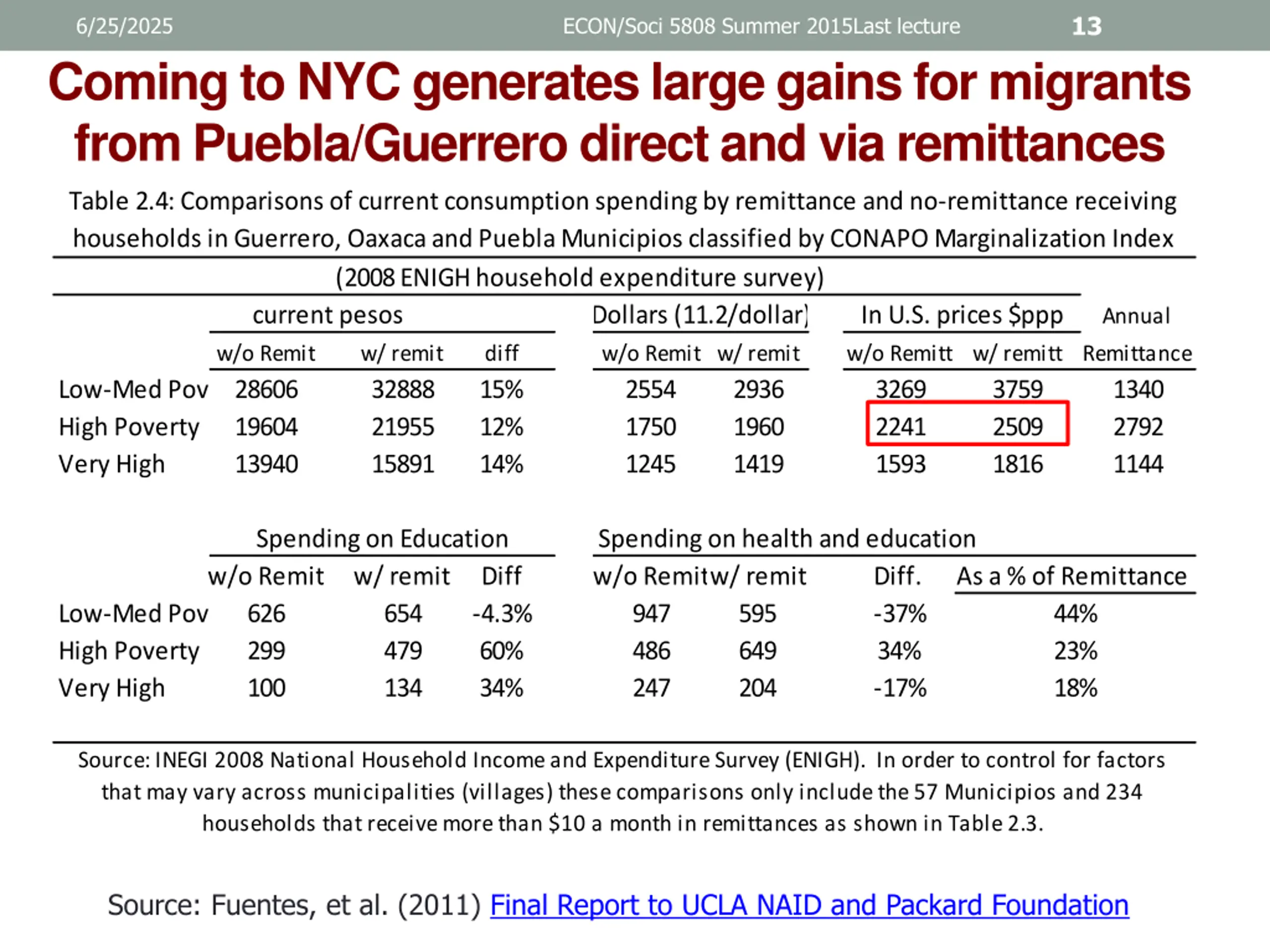 12 6/25/2025 ECON/Soci 5808 Summer 2015Last lecture UCLA-NAID Forham CIPS migration survey shows large income gains for migrants from Mexico in New York City: Migration raises income from $1600 per year to about $12,000 that is from $130/month to about $1000/month for each breadwinner with less than 9 years of education from poorest Municipios in Puebla and Guererro raises 1/ Remittances sent to Mexico raise incomes for those left behind from $130/month to $230/month in high poverty and severe Municipios (data from ENIGH) Going to college pays in New York City (compared to LA and Durham, NC) earnings for Mexican immigrants in U.S. for less than 10 years go from $26,000 to $36,000/year about 50% higher than in LA or Durham, NC. 1/ We asked everyone of the over 100 immigrants we interviewed where they were from (what Municipio in Mexico). All but two were from rural areas of Puebla and Guerrero, the estimate of $130 a month is for the poorest Municipios (based on Mexico s national household expenditure survey). The $12,000 earnings are for immigrants living in New York from Mexico for less than ten years, as computed using the combined 2005-2009 ACS for NYC, this is also roughly equal to expenditures per employed worker in the households in our survey.