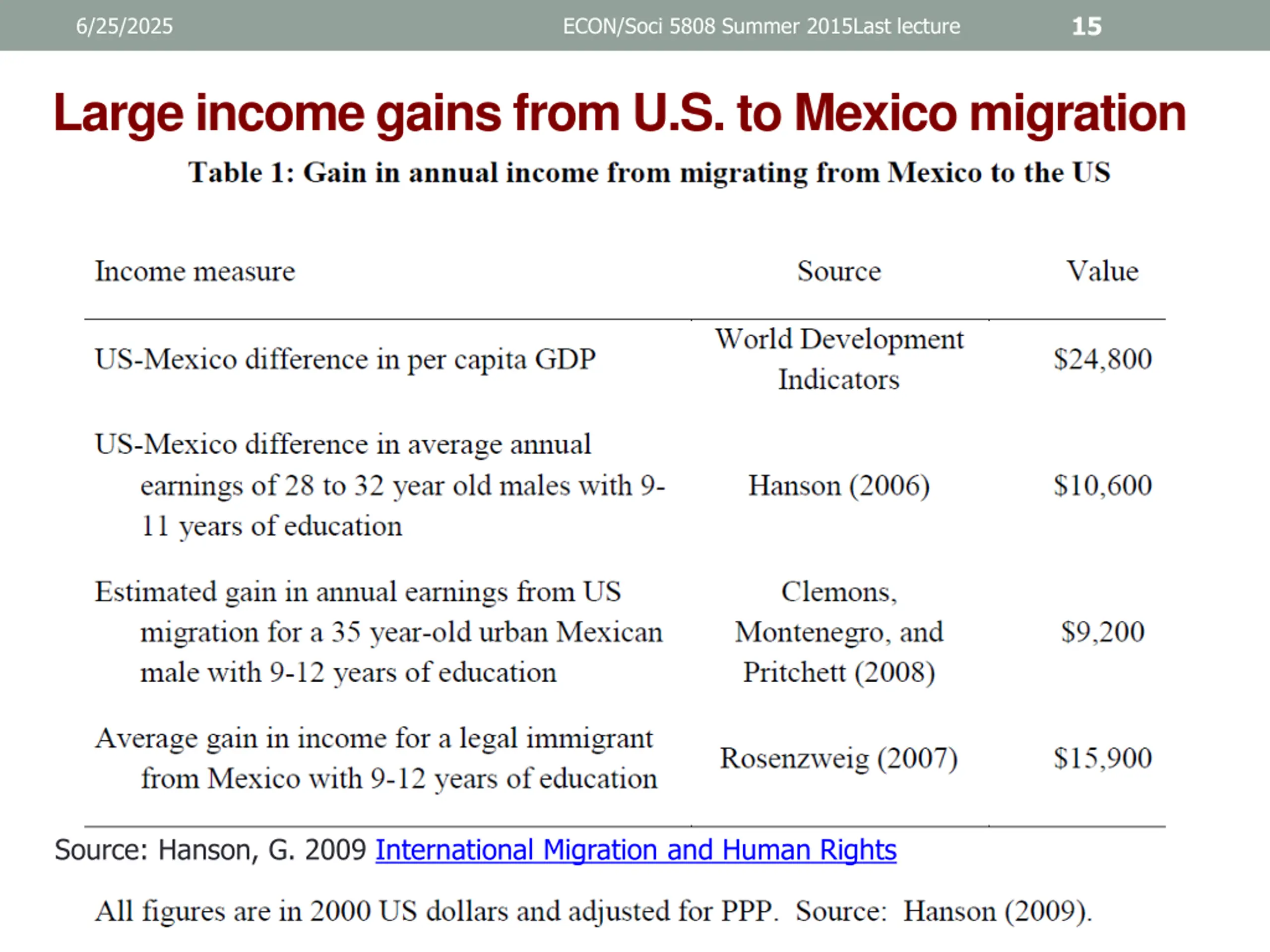15 6/25/2025 ECON/Soci 5808 Summer 2015Last lecture Large income gains from U.S. to Mexico migration Source: Hanson, G. 2009 International Migration and Human Rights