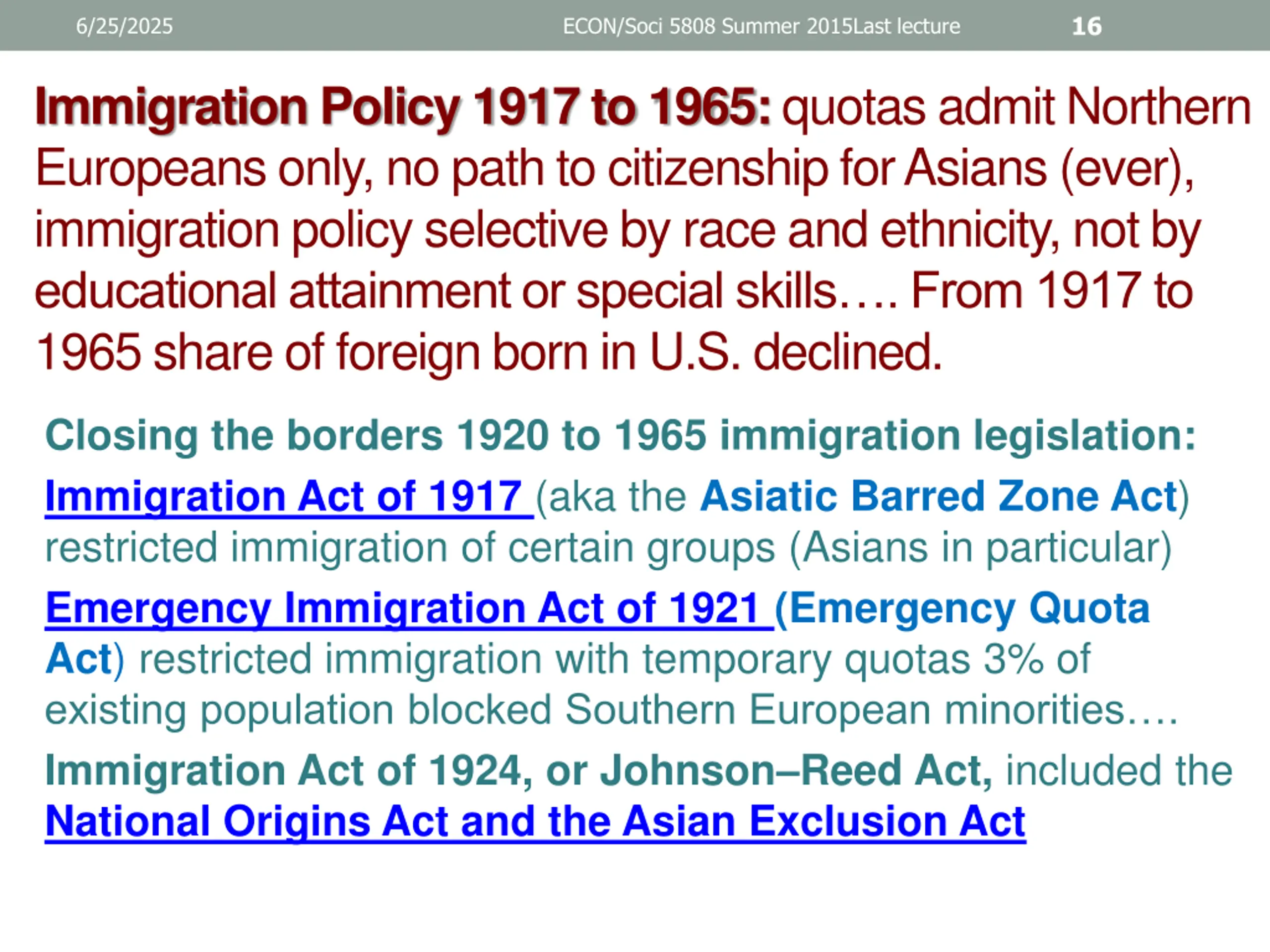 16 6/25/2025 ECON/Soci 5808 Summer 2015Last lecture Immigration Policy 1917 to 1965: quotas admit Northern Europeans only, no path to citizenship for Asians (ever), immigration policy selective by race and ethnicity, not by educational attainment or special skills . From 1917 to 1965 share of foreign born in U.S. declined. Closing the borders 1920 to 1965 immigration legislation: Immigration Act of 1917 (aka the Asiatic Barred Zone Act) restricted immigration of certain groups (Asians in particular) Emergency Immigration Act of 1921 (Emergency Quota Act) restricted immigration with temporary quotas 3% of existing population blocked Southern European minorities . Immigration Act of 1924, or Johnson Reed Act, included the National Origins Act and the Asian Exclusion Act