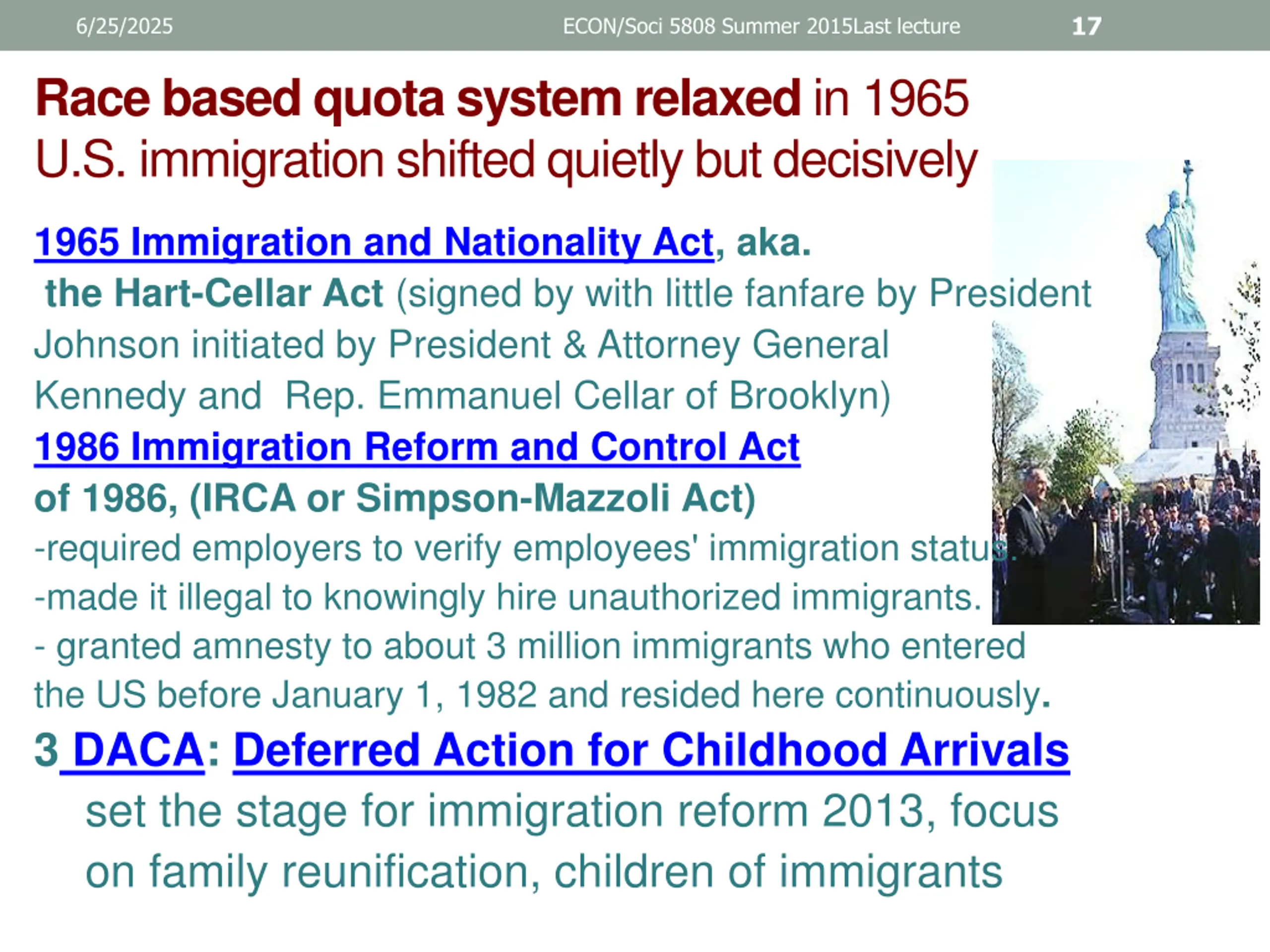 17 6/25/2025 ECON/Soci 5808 Summer 2015Last lecture Race based quota system relaxed in 1965 U.S. immigration shifted quietly but decisively 1965 Immigration and Nationality Act, aka. the Hart-Cellar Act (signed by with little fanfare by President Johnson initiated by President & Attorney General Kennedy and Rep. Emmanuel Cellar of Brooklyn) 1986 Immigration Reform and Control Act of 1986, (IRCA or Simpson-Mazzoli Act) -required employers to verify employees' immigration status. -made it illegal to knowingly hire unauthorized immigrants. - granted amnesty to about 3 million immigrants who entered the US before January 1, 1982 and resided here continuously. 3 DACA: Deferred Action for Childhood Arrivals set the stage for immigration reform 2013, focus on family reunification, children of immigrants