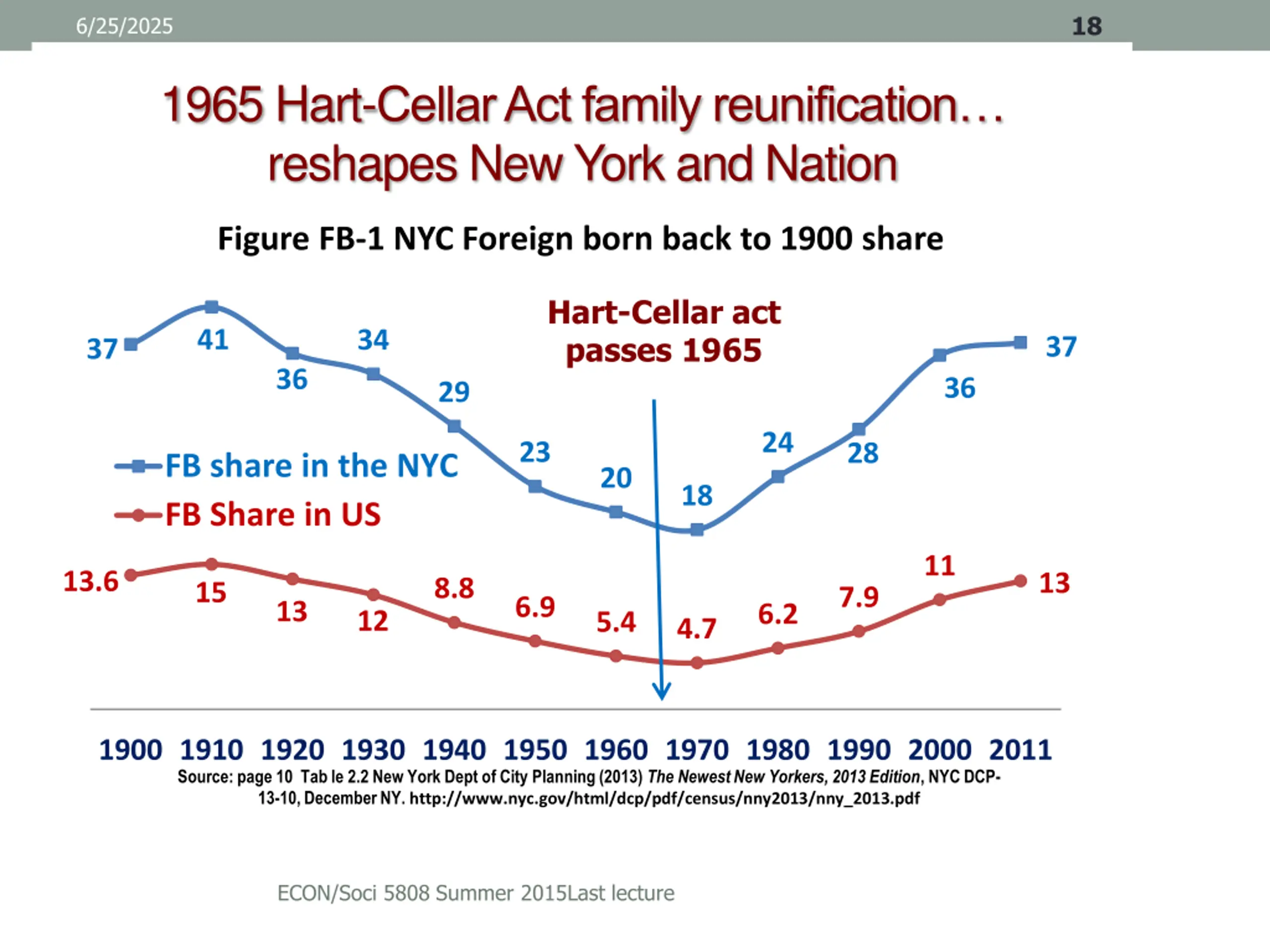 18 6/25/2025 1965 Hart-Cellar Act family reunification reshapes New York and Nation Figure FB-1 NYC Foreign born back to 1900 share Hart-Cellar act passes 1965 41 34 37 37 36 36 29 24 23 28 FB share in the NYC FB Share in US 20 18 11 13.6 13 8.8 15 7.9 6.9 13 6.2 12 5.4 4.7 1900 1910 1920 1930 1940 1950 1960 1970 1980 1990 2000 2011 Source: page 10 Tab le 2.2 New York Dept of City Planning (2013) The Newest New Yorkers, 2013 Edition, NYC DCP- 13-10, December NY. http://www.nyc.gov/html/dcp/pdf/census/nny2013/nny_2013.pdf ECON/Soci 5808 Summer 2015Last lecture