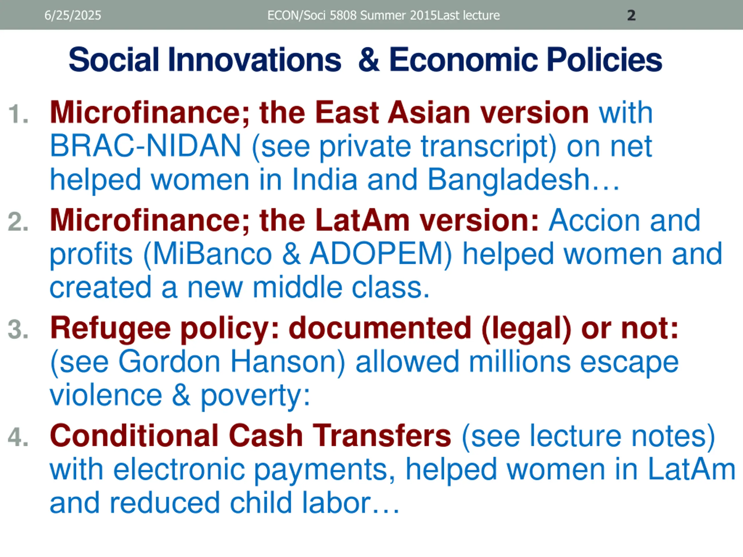 2 6/25/2025 ECON/Soci 5808 Summer 2015Last lecture Social Innovations & Economic Policies 1. Microfinance; the East Asian version with BRAC-NIDAN (see private transcript) on net helped women in India and Bangladesh 2. Microfinance; the LatAm version: Accion and profits (MiBanco & ADOPEM) helped women and created a new middle class. 3. Refugee policy: documented (legal) or not: (see Gordon Hanson) allowed millions escape violence & poverty: 4. Conditional Cash Transfers (see lecture notes) with electronic payments, helped women in LatAm and reduced child labor