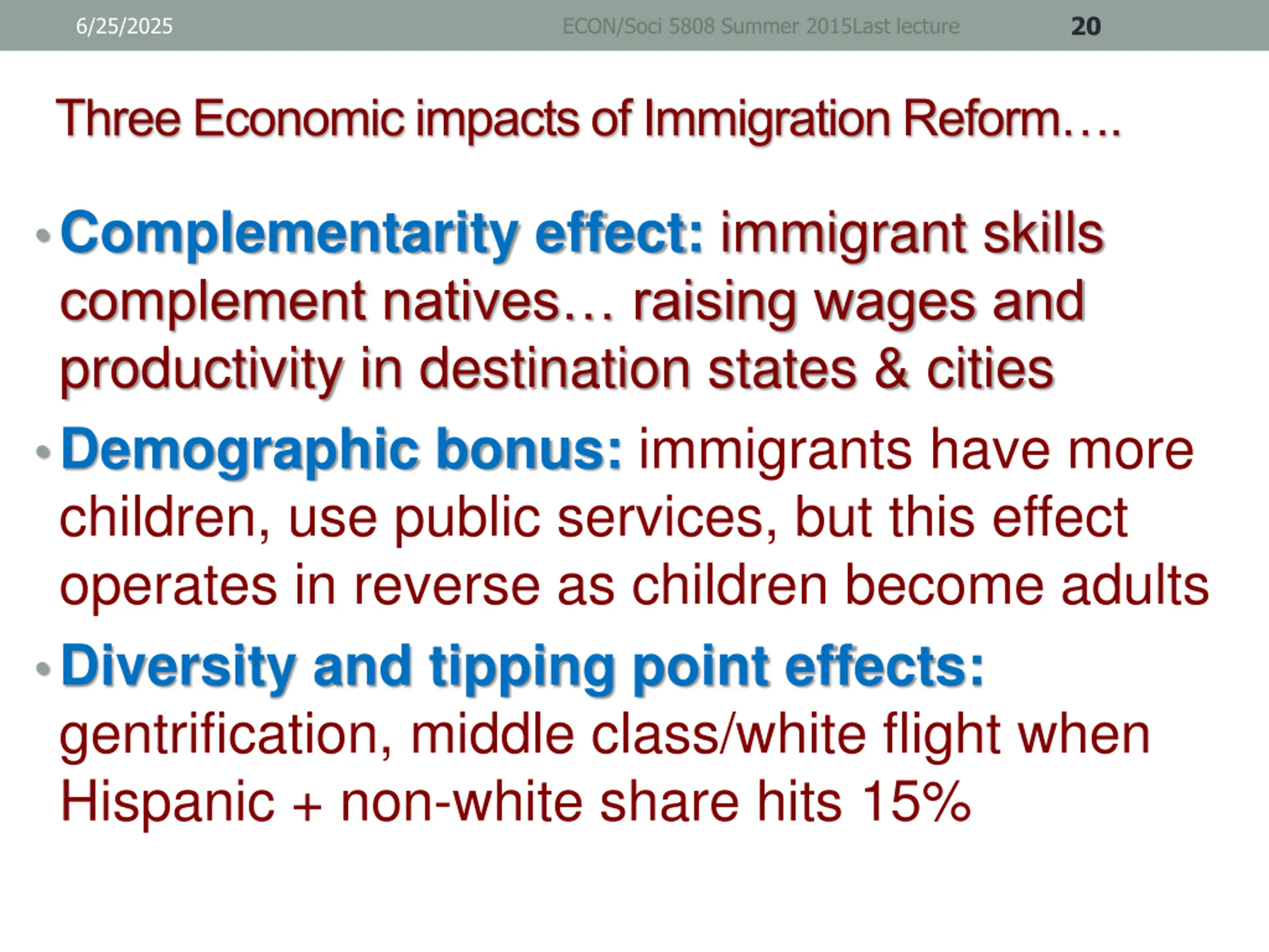 20 6/25/2025 ECON/Soci 5808 Summer 2015Last lecture Three Economic impacts of Immigration Reform . Complementarity effect: immigrant skills complement natives raising wages and productivity in destination states & cities Demographic bonus: immigrants have more children, use public services, but this effect operates in reverse as children become adults Diversity and tipping point effects: gentrification, middle class/white flight when Hispanic + non-white share hits 15%