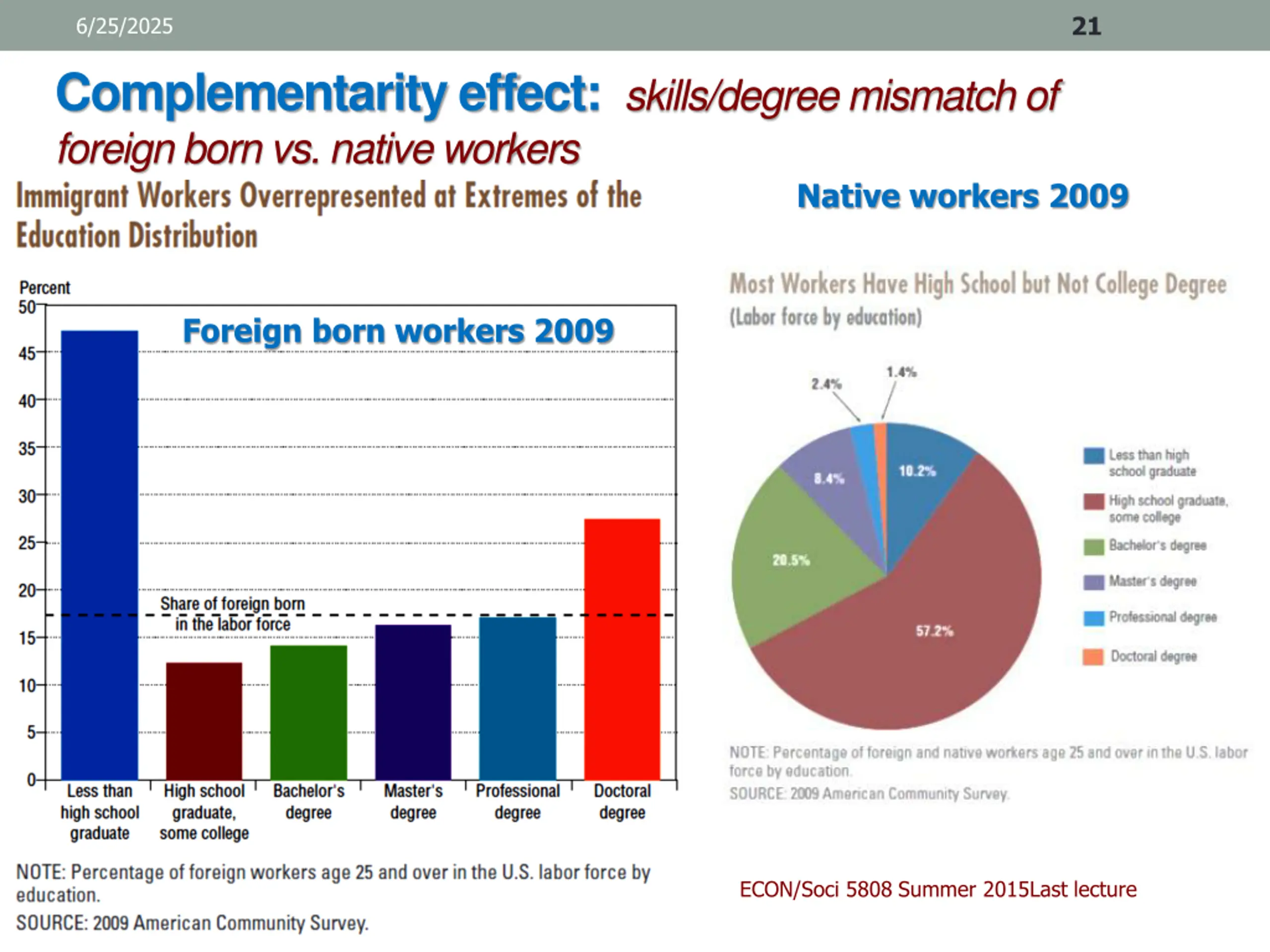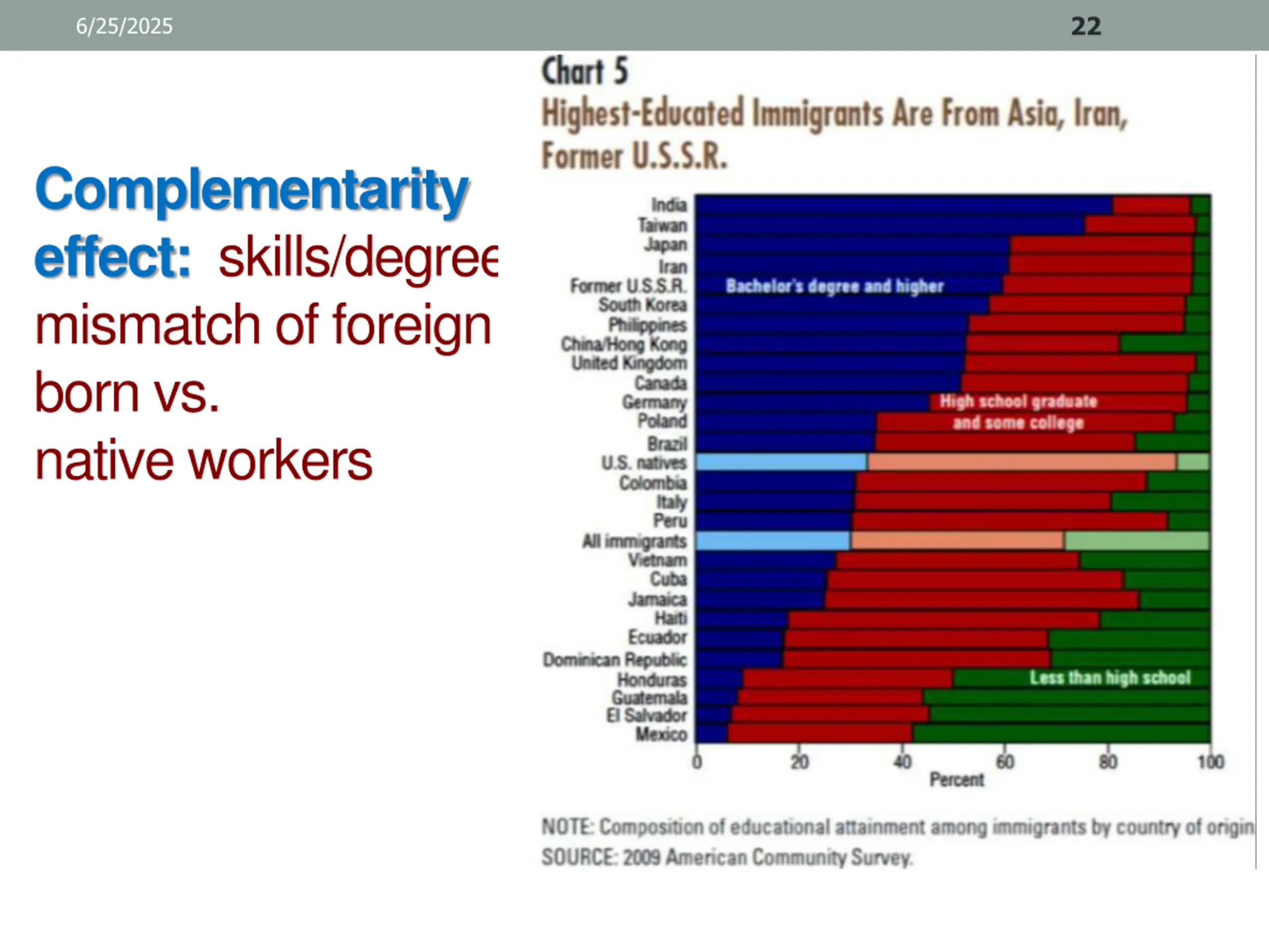 22 6/25/2025 Complementarity effect: skills/degree mismatch of foreign born vs. native workers ECON/Soci 5808 Summer 2015Last lecture